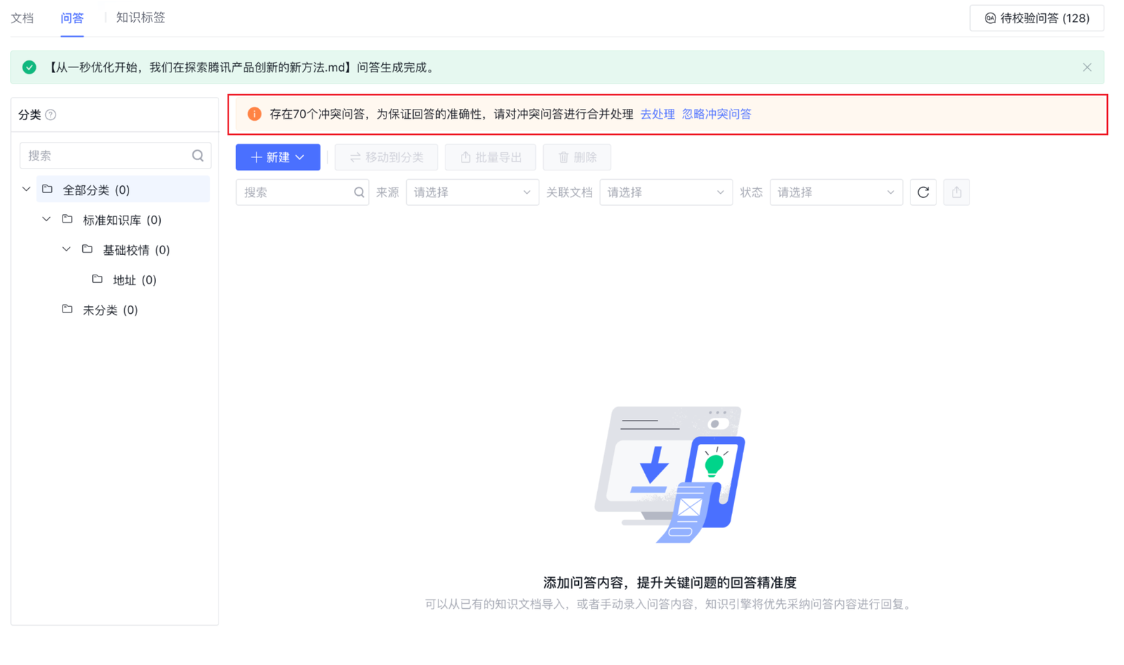 冲突问答:通过大模型自动生成的问答对可能存在冲突,即同一个问题存在两个不同答案。为保证回答的准确性,请对冲突问答进行合并处理,系统会通过置顶消息提示存在冲突问答,您可通过单击去处理保留冲突问答的答案。