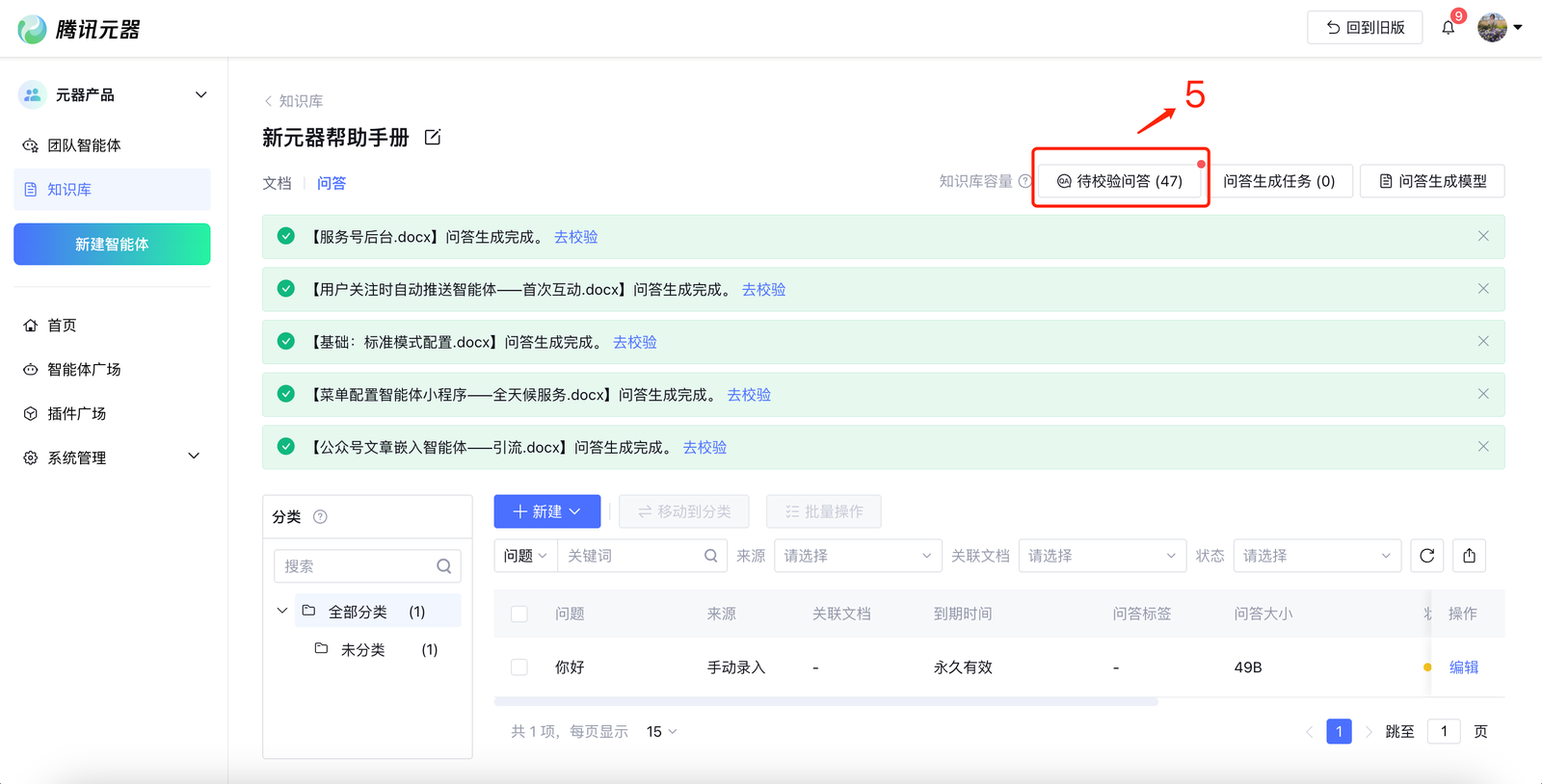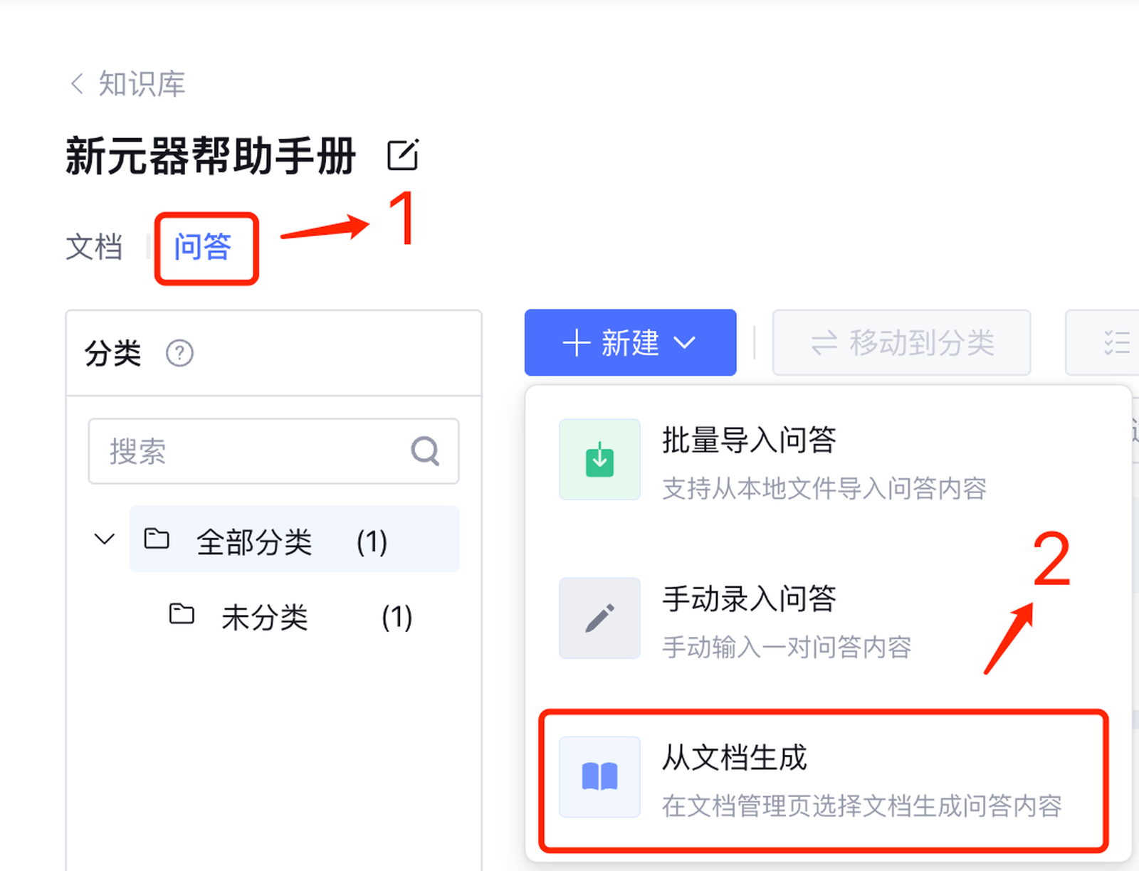 进入知识库,切换到问答,点击新建即可创建QA手册。