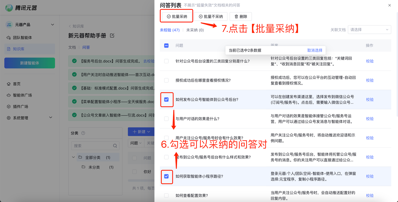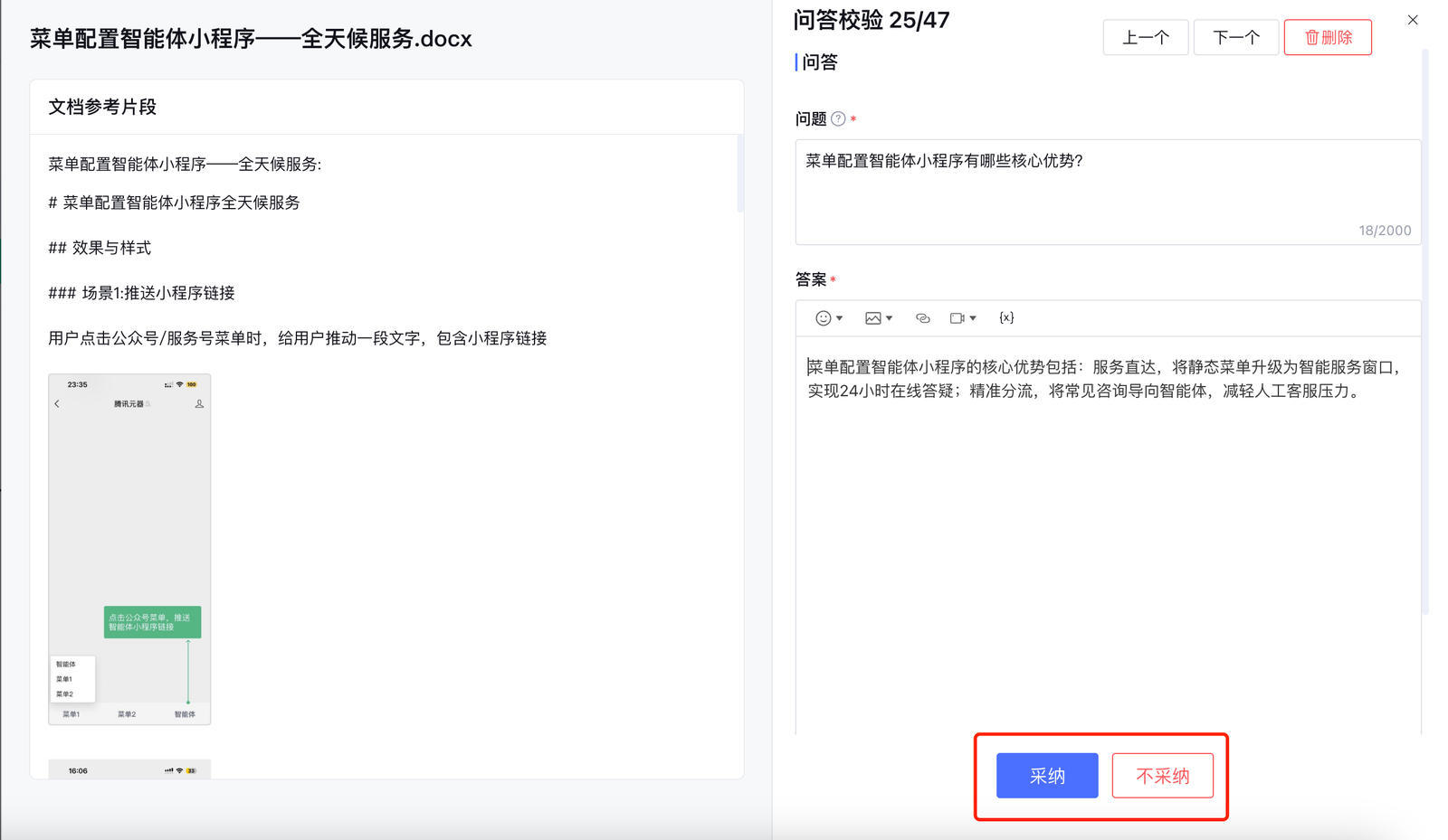 校验正确后单击采纳,则会将问答纳入问答知识库;不采纳的问题不会生效,可稍后在未采纳分页里查看和修改。