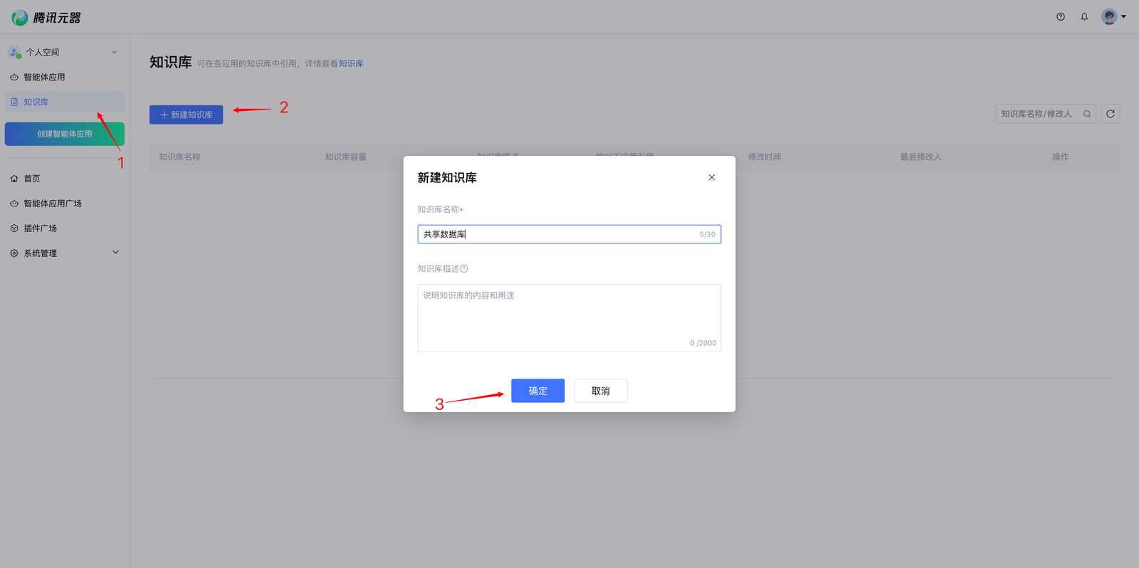 3、填写知识库名称与描述,点击确定,完成知识库的创建。