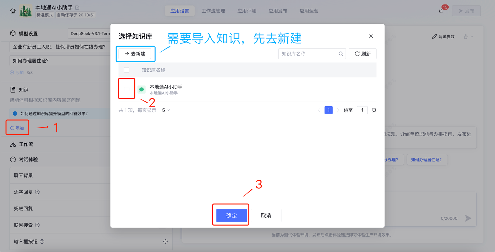 5、导入知识后,在智能体应用设置中添加这个知识库