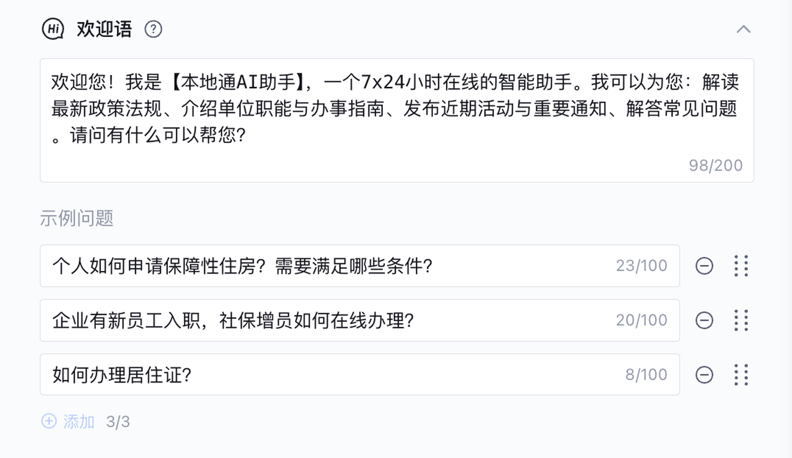欢迎语能让使用者第一时间明白您的智能体能做什么、不能做什么;示例问题通过"提问范例"降低使用门槛,引导用户提出高质量的问题,从而更高效地获得智能体的帮助。
