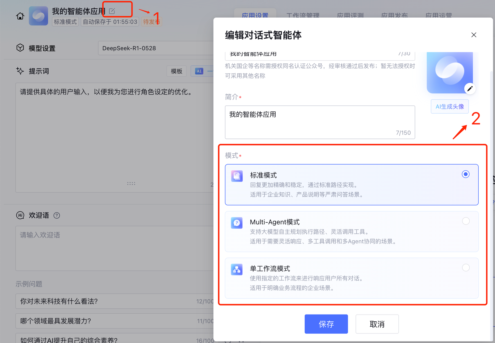 可以在应用配置中点击智能体名称下的模式,在编辑智能体弹窗中修改模式。