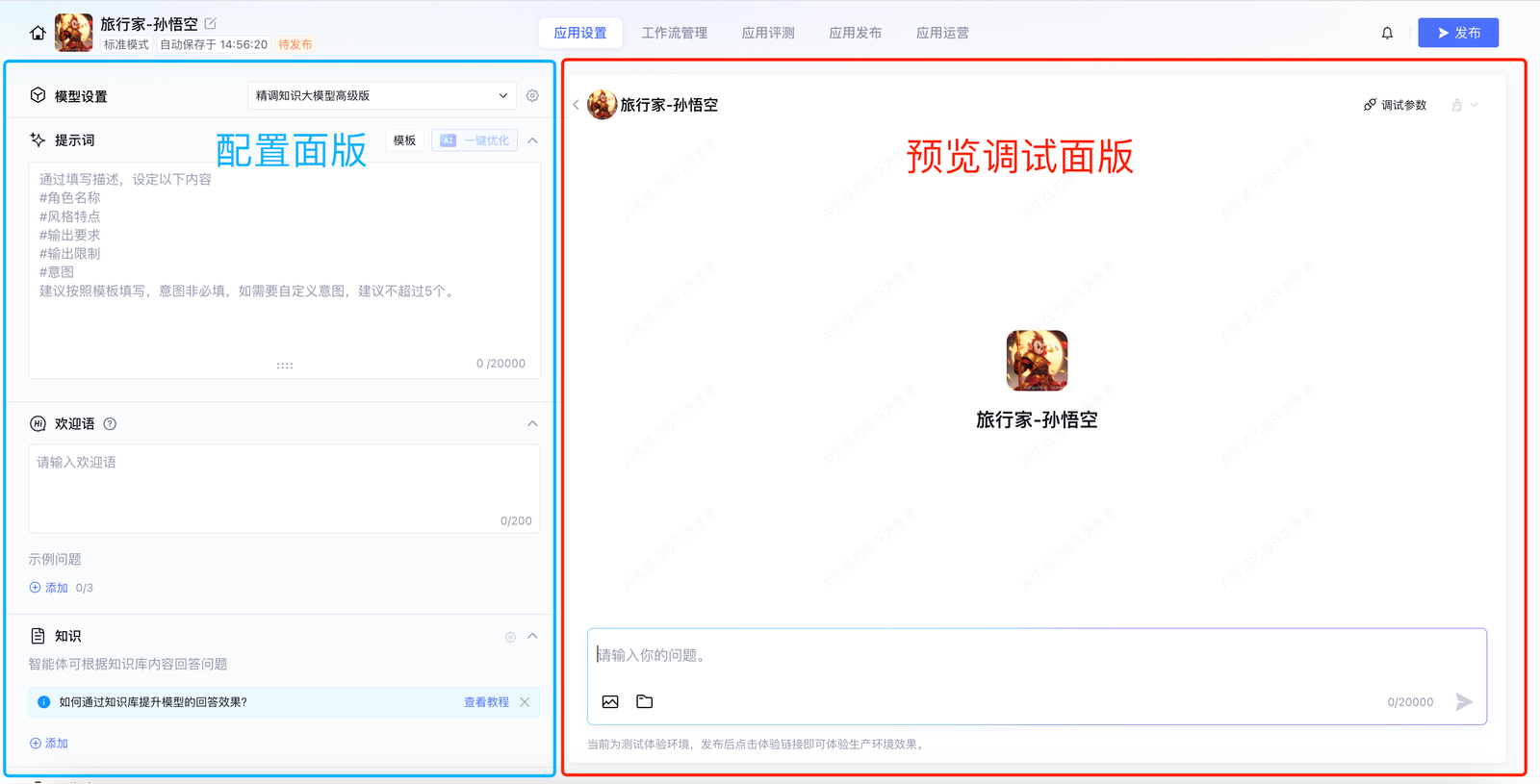 预览与调试面版:页面右侧的预览页面用于显示智能体的响应效果并对其进行调试。