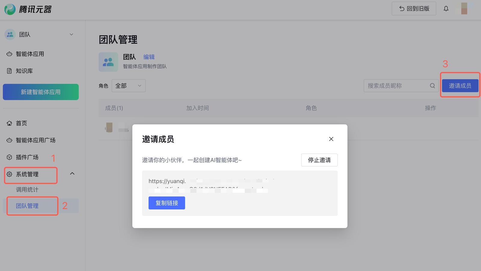 5. 团队管理员可以发送邀请链接,在团队内加入其他成员: