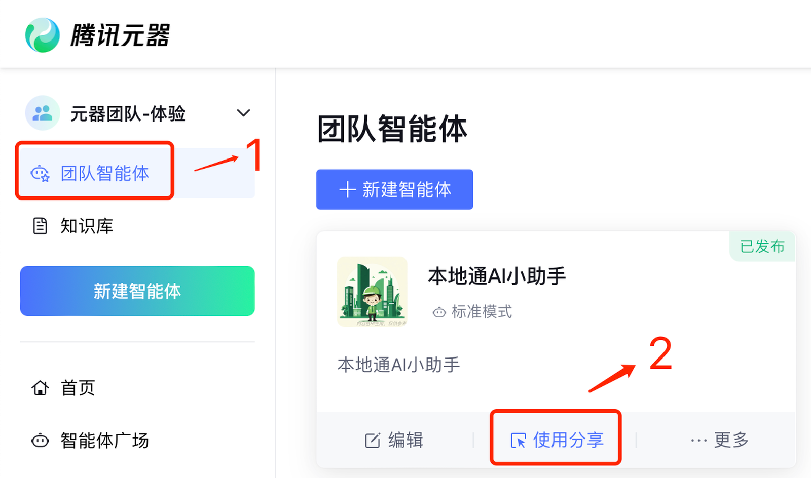Web体验:个人/团队空间-智能体-使用分享,选择:元器官网-立即访问