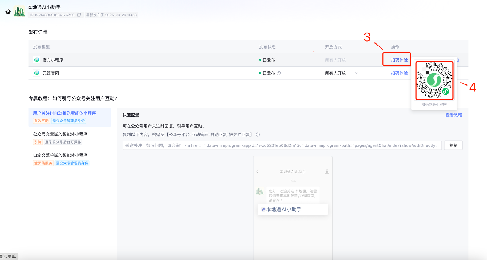 小程序体验:个人/团队空间-智能体-使用分享,选择:官方小程序-扫码体验