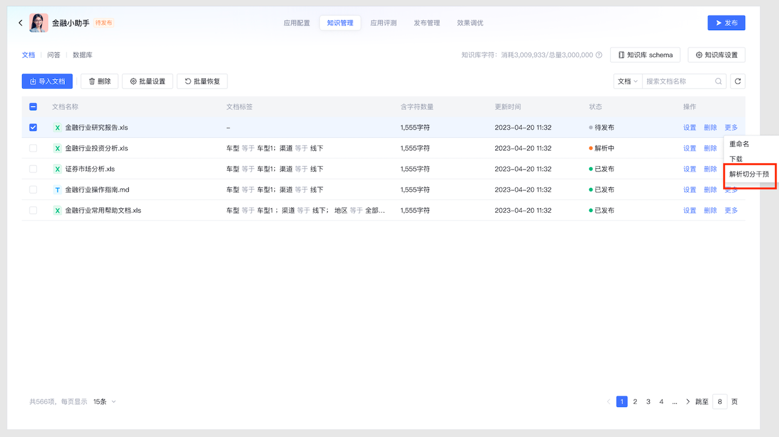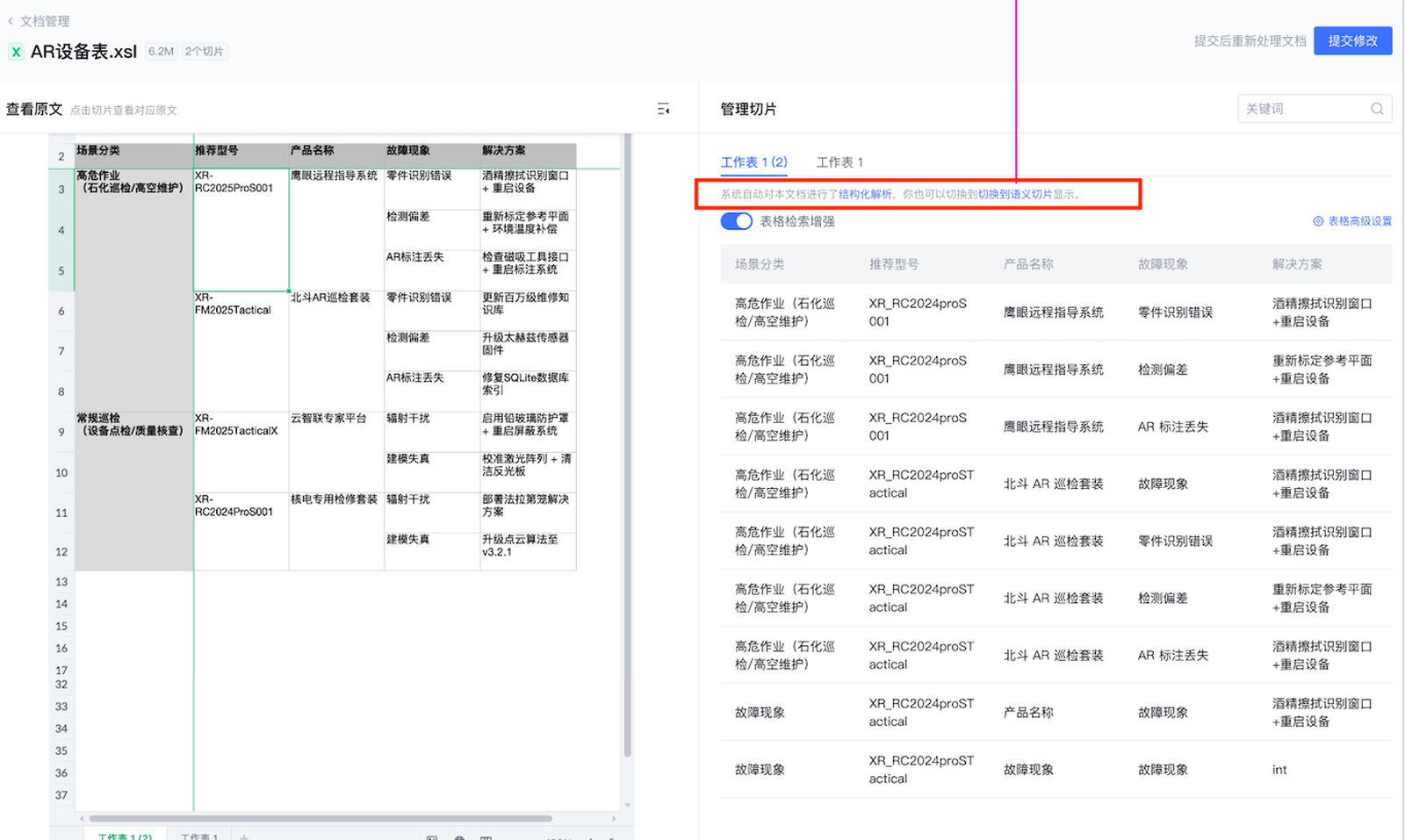 结构化表格文件上传后,您可以在文档列表点击解析切分干预,进入二级页面后,查看结构化显示。