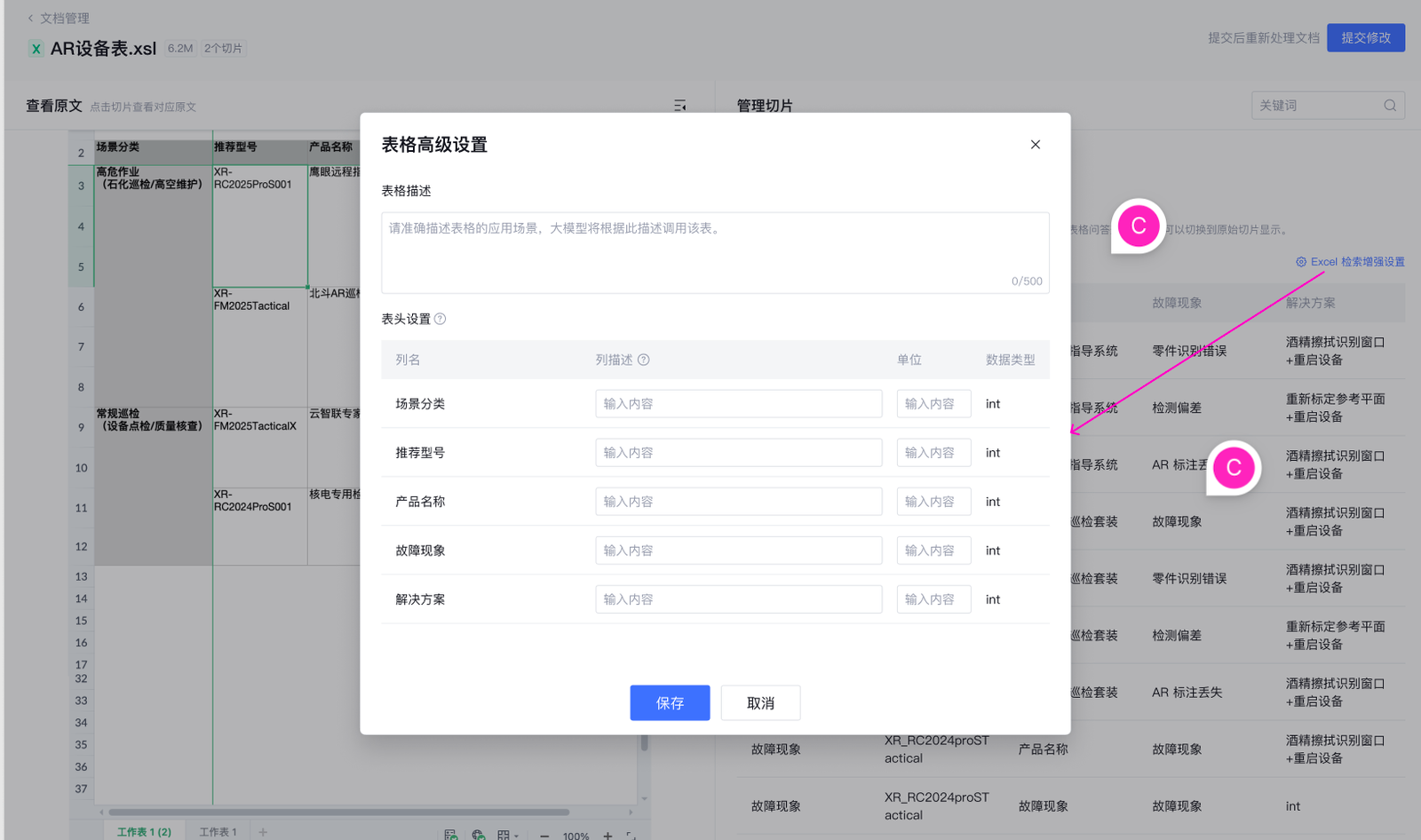 对于结构化表格文件,您可以点击「表头高级设置」,对表格添加描述、或者自定义表头释义,以提升表格检索和问答准确率。
