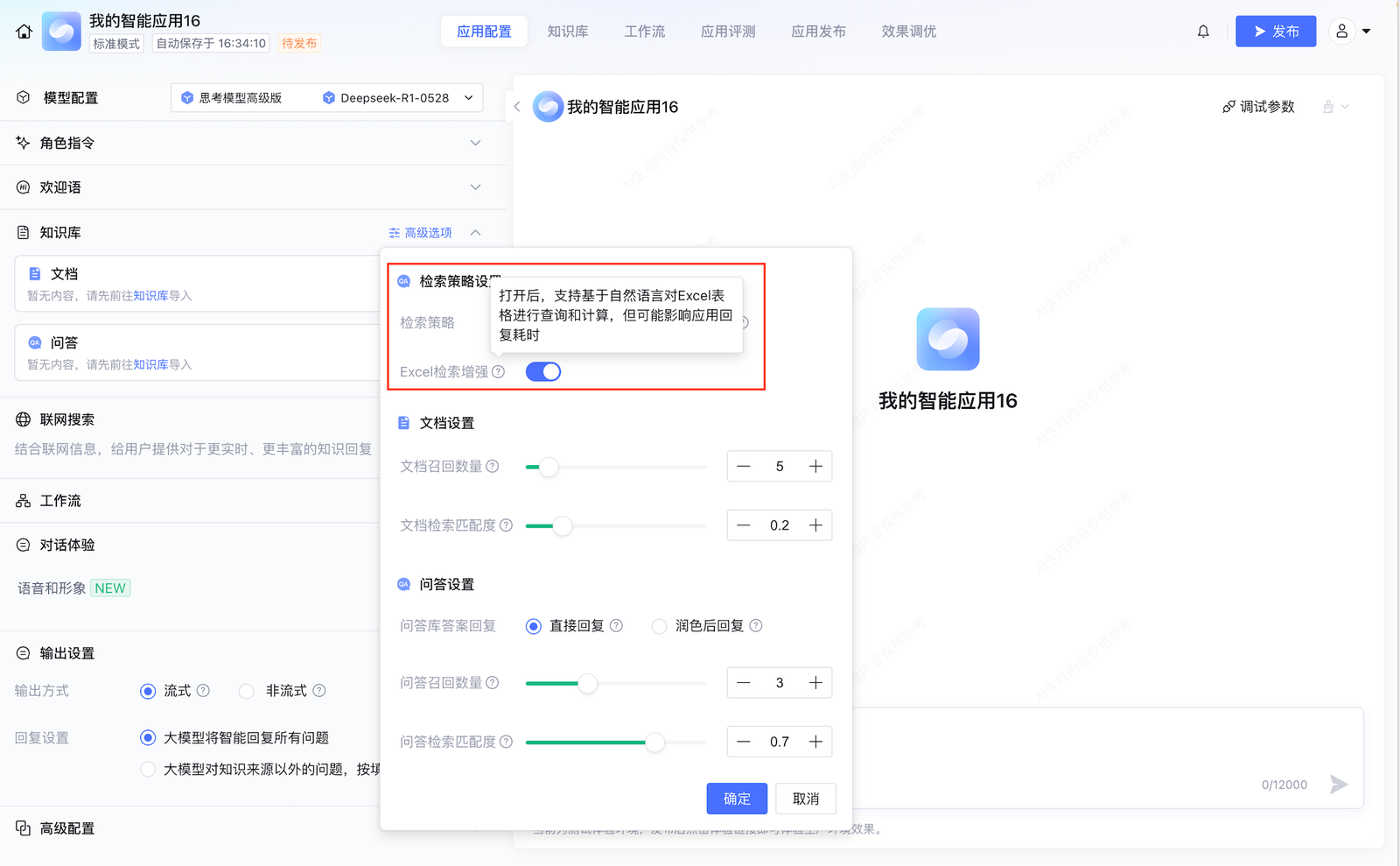 当您在应用配置-知识库高级设置中,开启「表格检索增强」开关后,将支持SQL方式查询结构化表格,提升用户基于自然语言对该类文件的的查询和计算准确率。如该开关关闭,则默认使用「语义检索」或「混合检索」策略,检索语义切片,来完成表格问答。