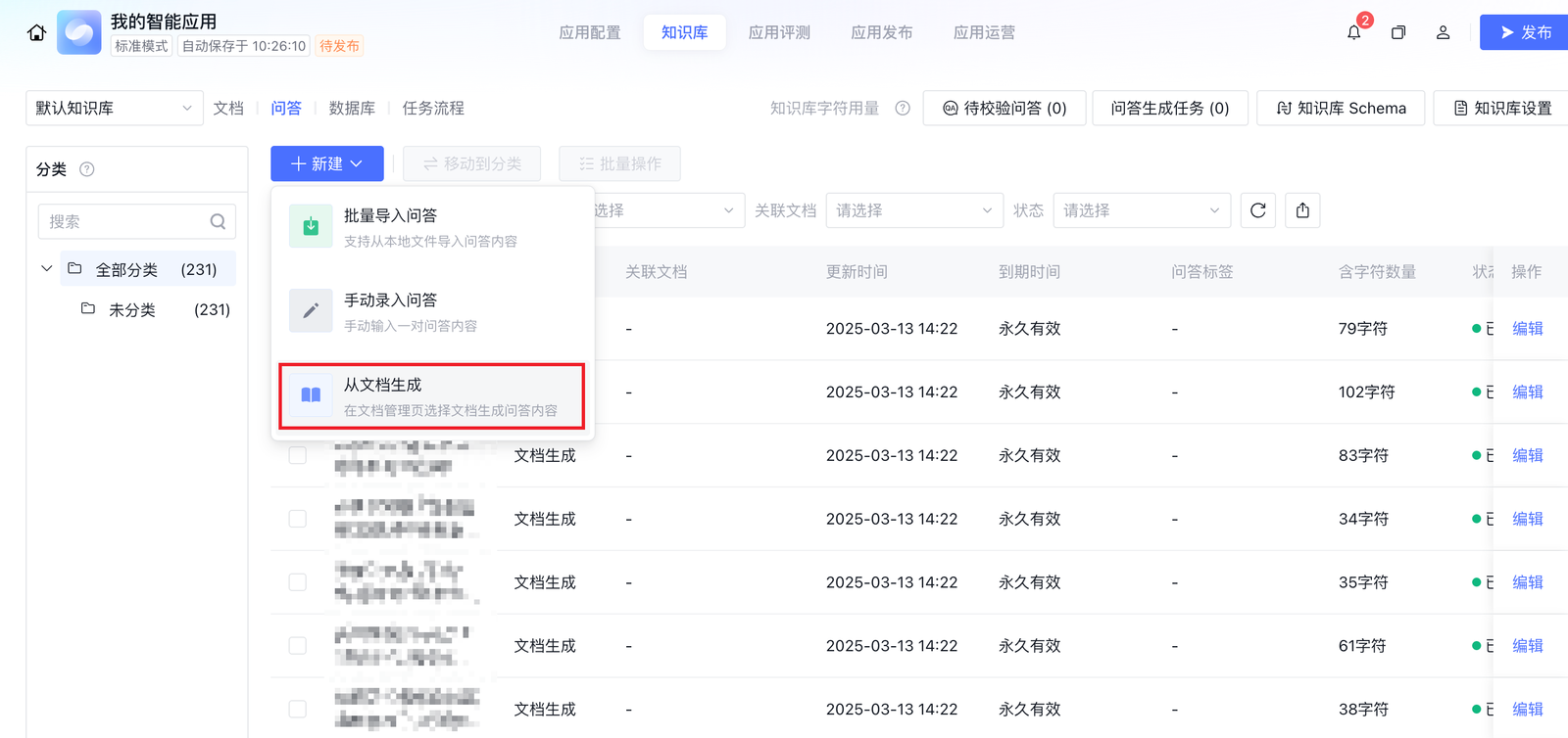 2. 单击新建,显示新建问答下拉框,选择从文档生成问答。