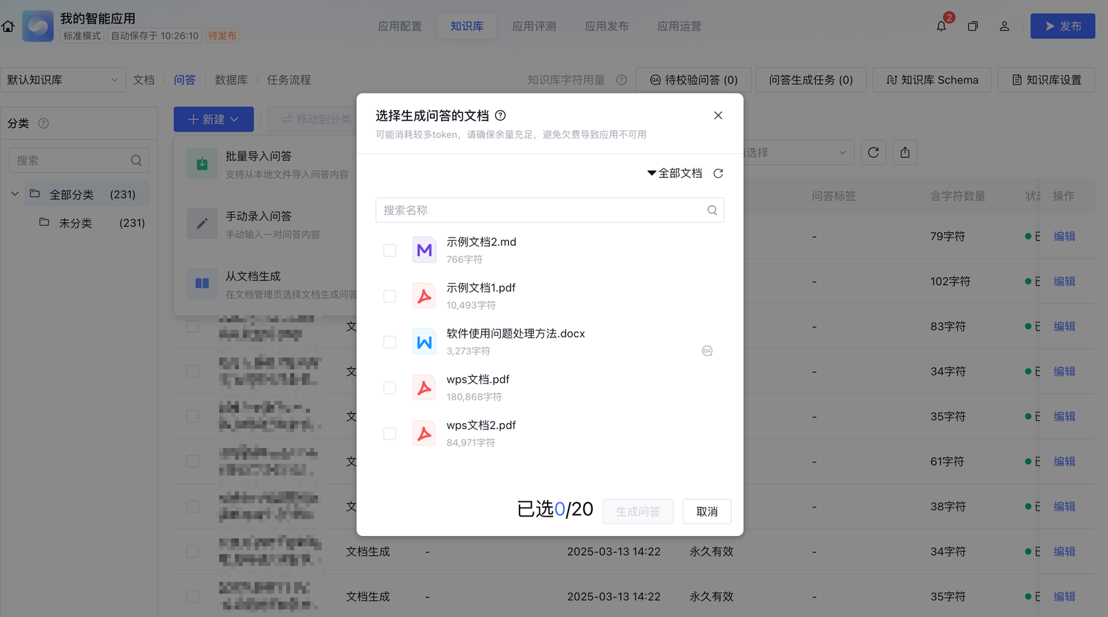 3. 进入选择文档页面,选择文档后,单击生成,后台将基于所选文档生成问答。