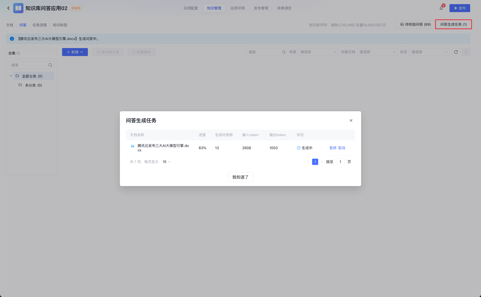 您可点击问答生成任务,查看任务状态。