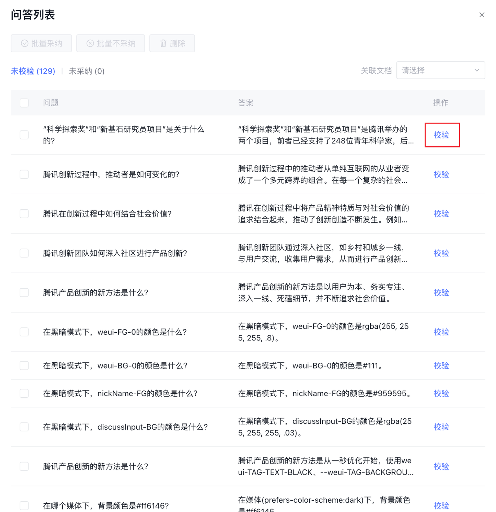 5. 单击待校验问答,对生成的问答结果进行人工校验,单击校验,可对生成的问题和答案进行修改。