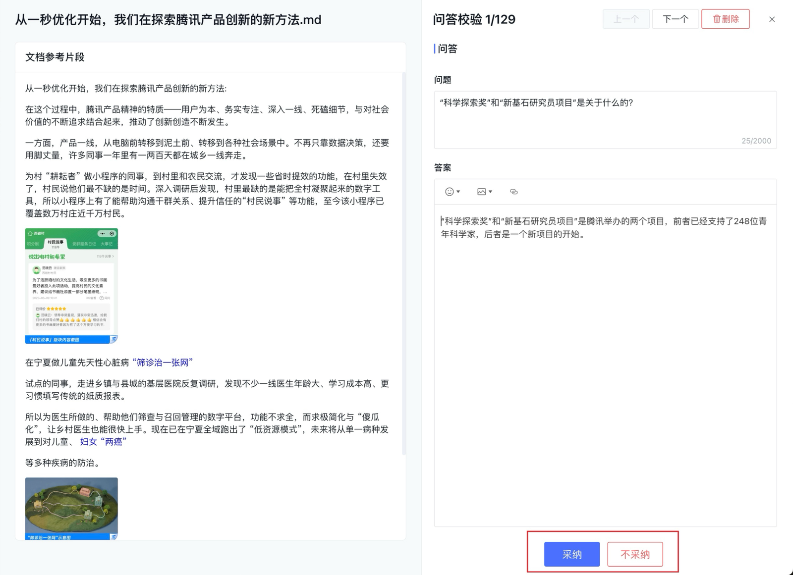 6. 校验正确后单击采纳,则会将问答纳入问答知识库;不采纳的问题不会生效,可稍后在未采纳分页里查看和修改。