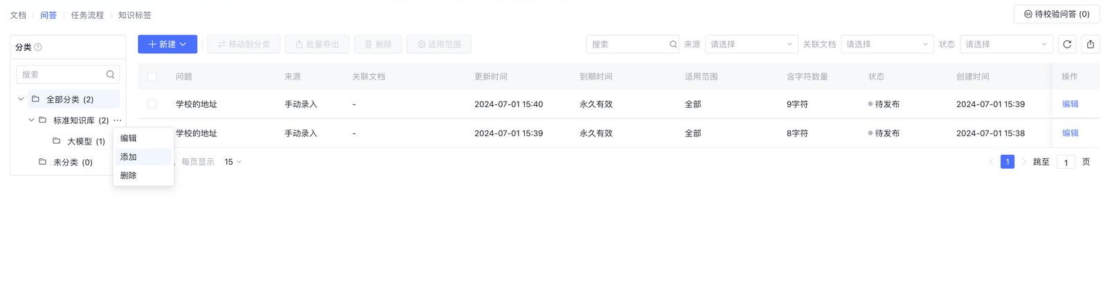 问答筛选:可以通过问答的来源、关联文档或状态对问答进行筛选。