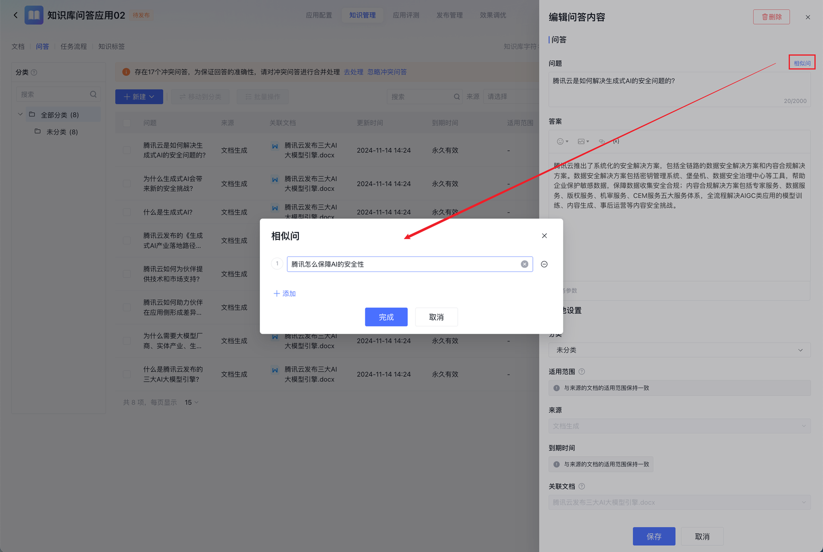 冲突问答:通过大模型自动生成的问答对可能存在冲突,即同一个问题存在两个不同答案。为保证回答的准确性,请对冲突问答进行合并处理,系统会通过置顶消息提示存在冲突问答,您可通过单击去处理保留冲突问答的答案。