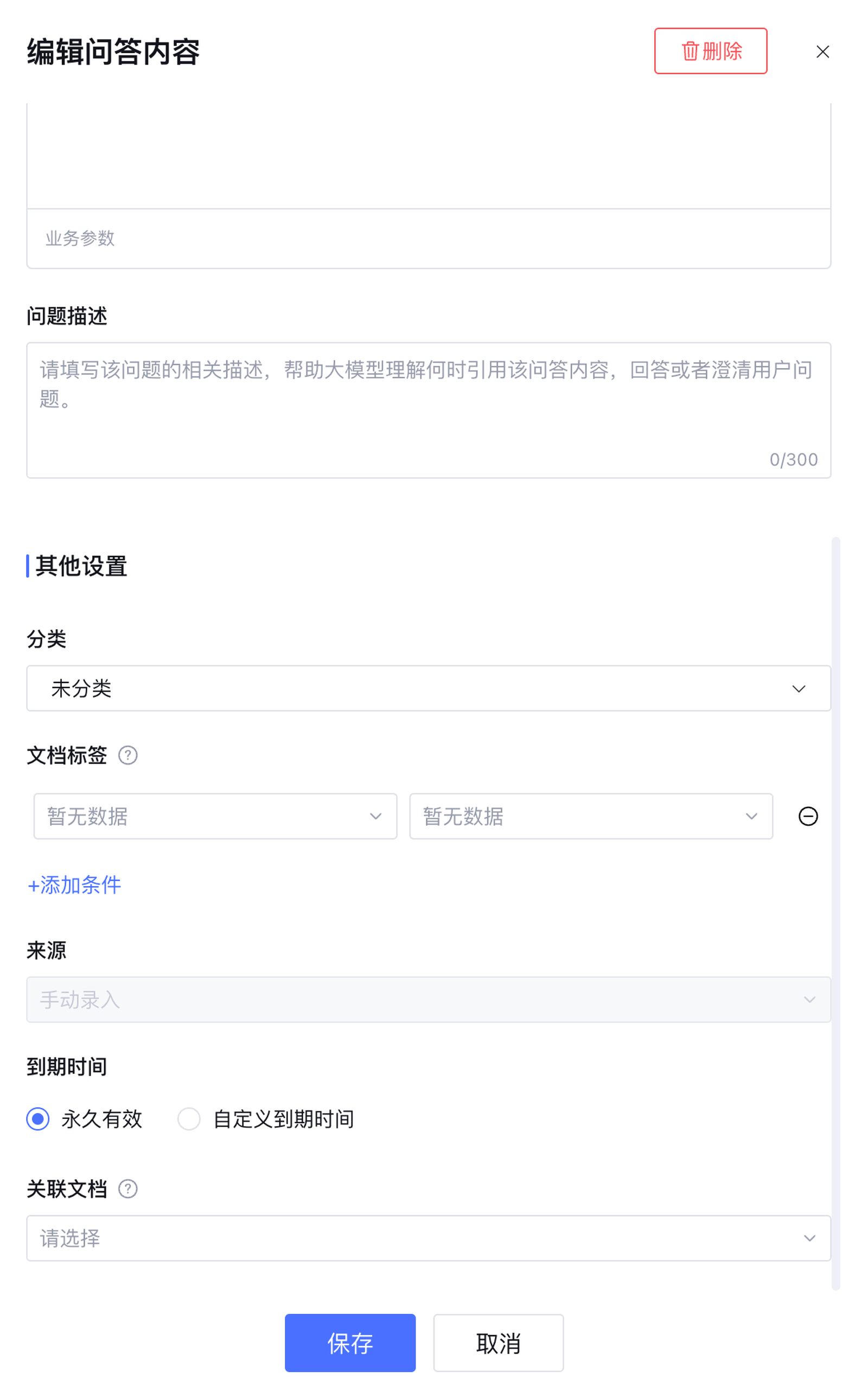 到期时间:问答知识的生效时间设置,可设置永久有效或自定义到期时间。若设定了自定义到期时间,在到期时间后,该问答知识将会自动失效。从文档生成的问答其到期时间与来源的文档保持一致,不可更改。