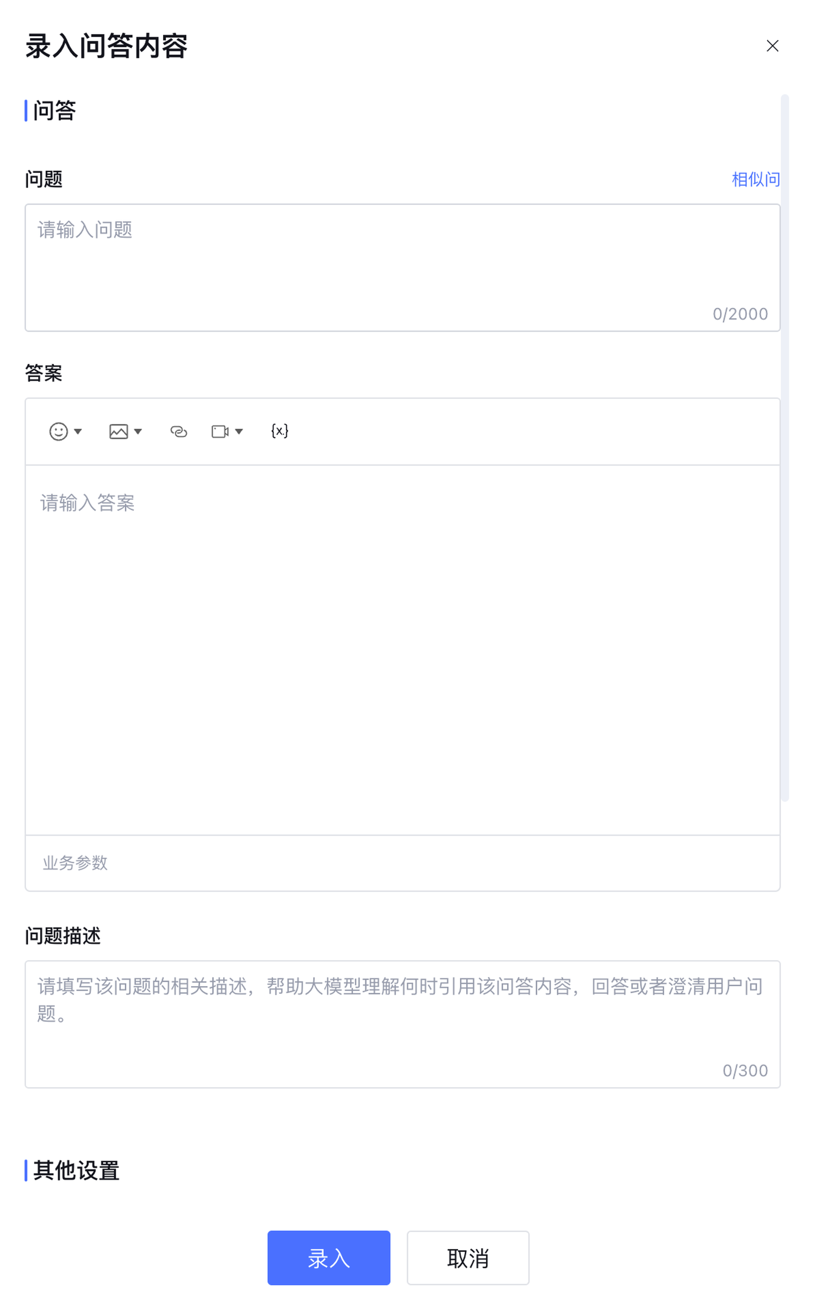 3. 在录入问答窗口完成问答内容输入后,单击录入,完成问答录入。