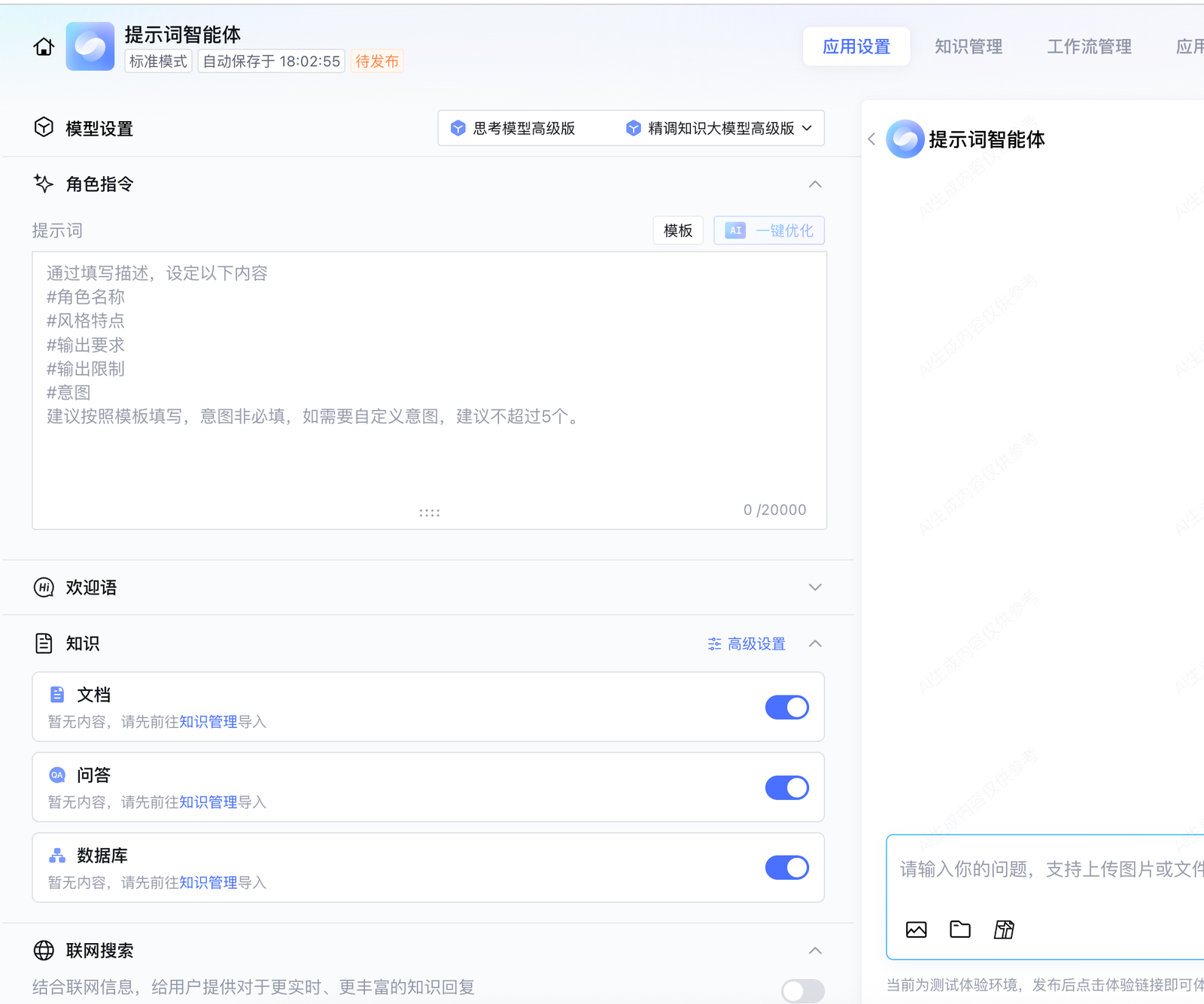 纯提示词模式的智能体,您可以直接在新元器上创建对话式智能体,进入标准模式。