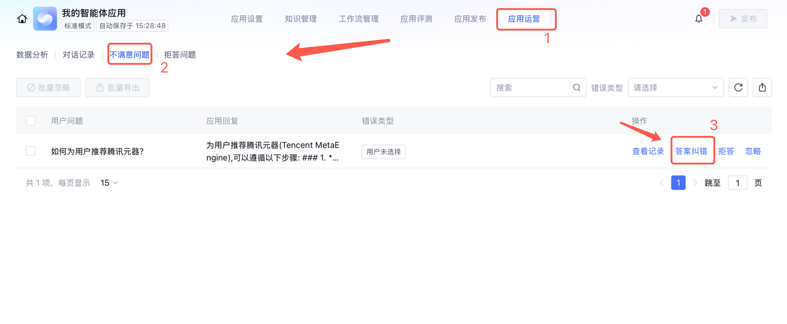 智能体的进步需要正确的引导,只有持续优化回答才能让智能体更加专业,符合目标您的需求。通过及时修正错误回答,您可以系统性优化智能体的知识体系,并为后续类似问题建立正确回答模版,提升回答质量。