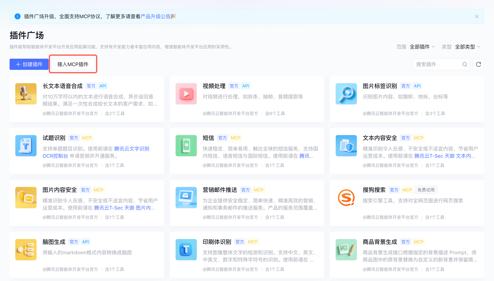 精选 MCP 插件:腾讯元器插件广场已预置了多款精选 MCP 插件,包含官方和第三方MCP插件,您可以在应用中一键添加使用。