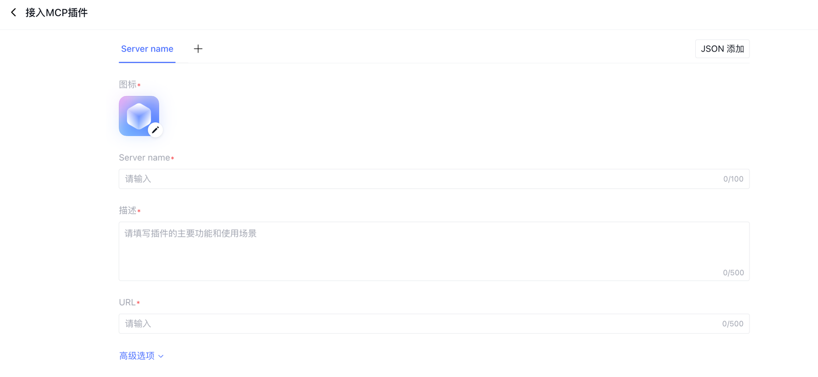 2. 在接入页面,填写 MCP Server 信息,包括名称、描述等字段,配置 URL 地址。