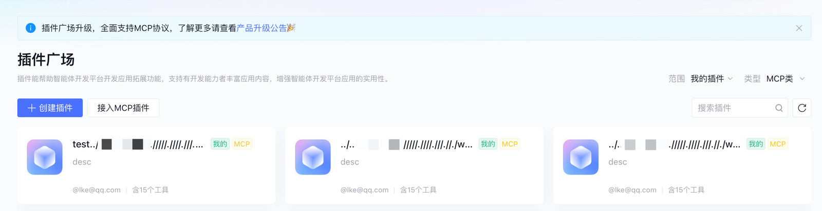 3. 保存后的 MCP 插件支持在插件广场进行查看、编辑、导出等动作,并且可以在工作流和 Multi-Agent 模式中直接 使用插件。