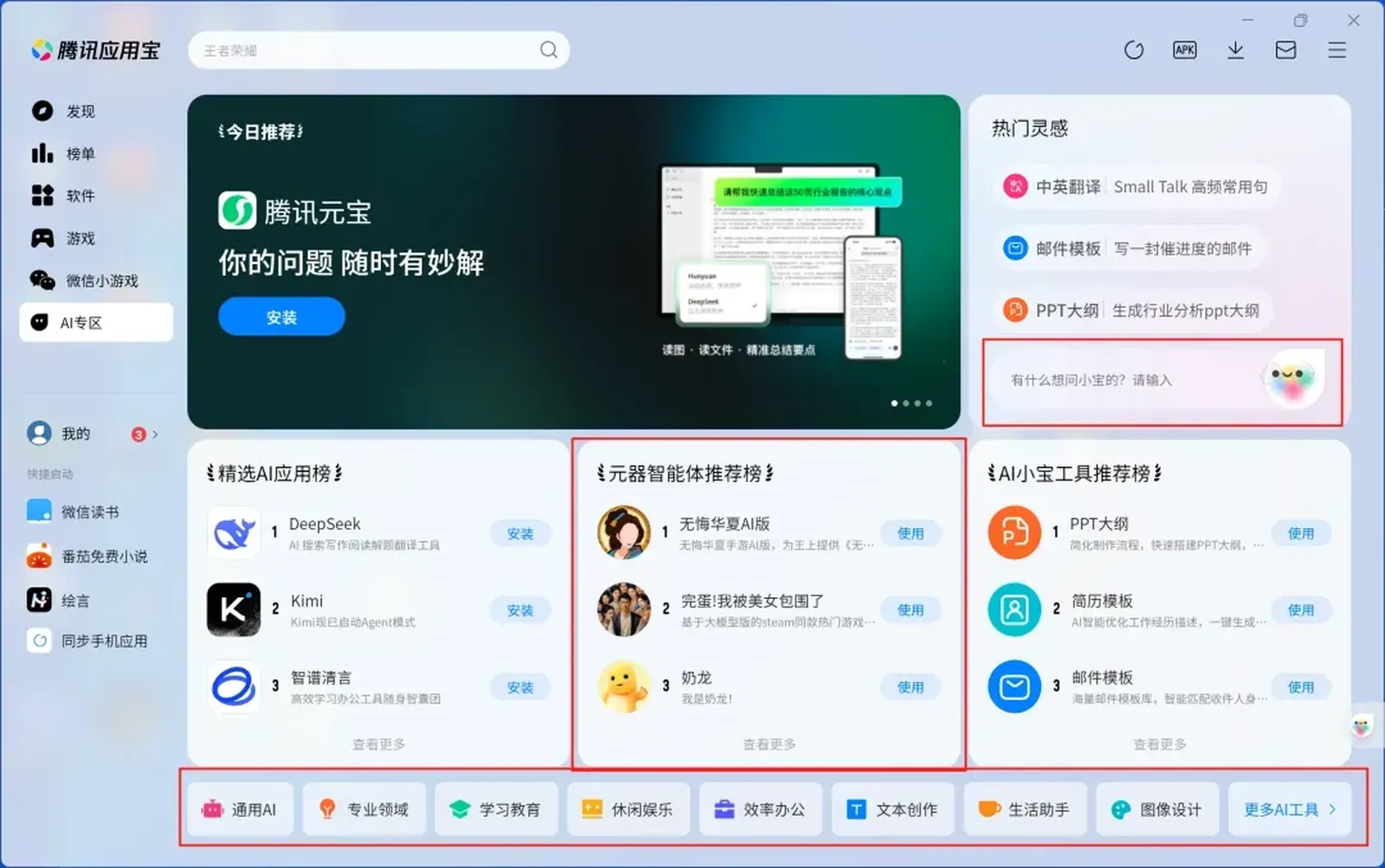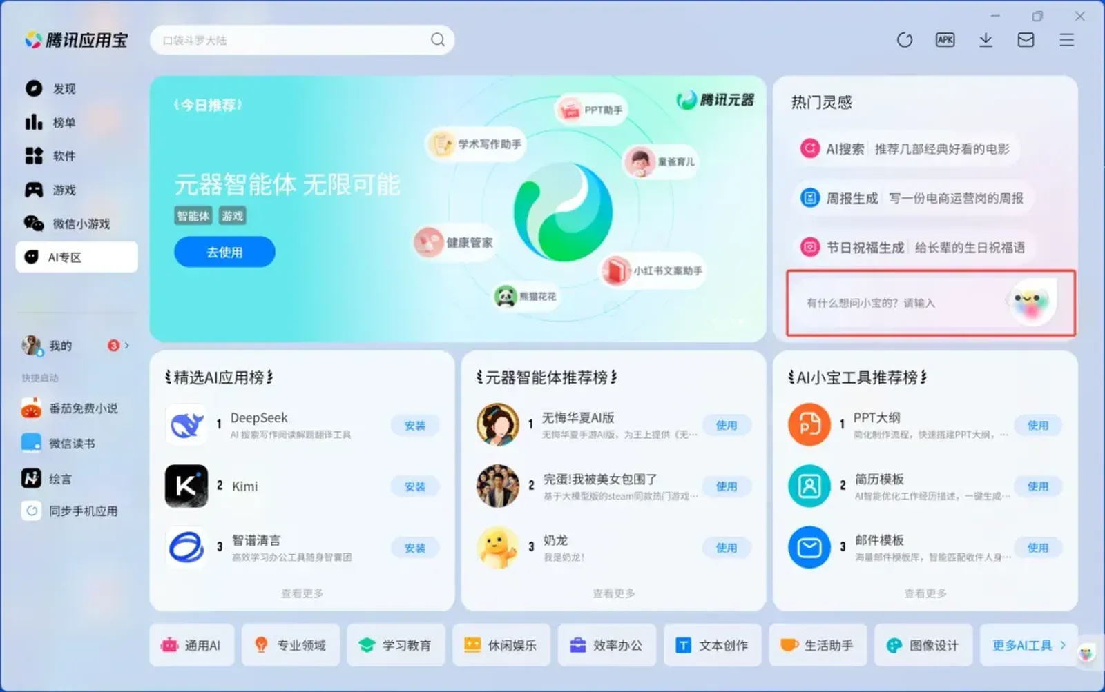 通过审核并符合平台标准的智能体,将在「腾讯应用宝电脑版-AI专区」上架,即点即用,无需下载、无需跳端。
