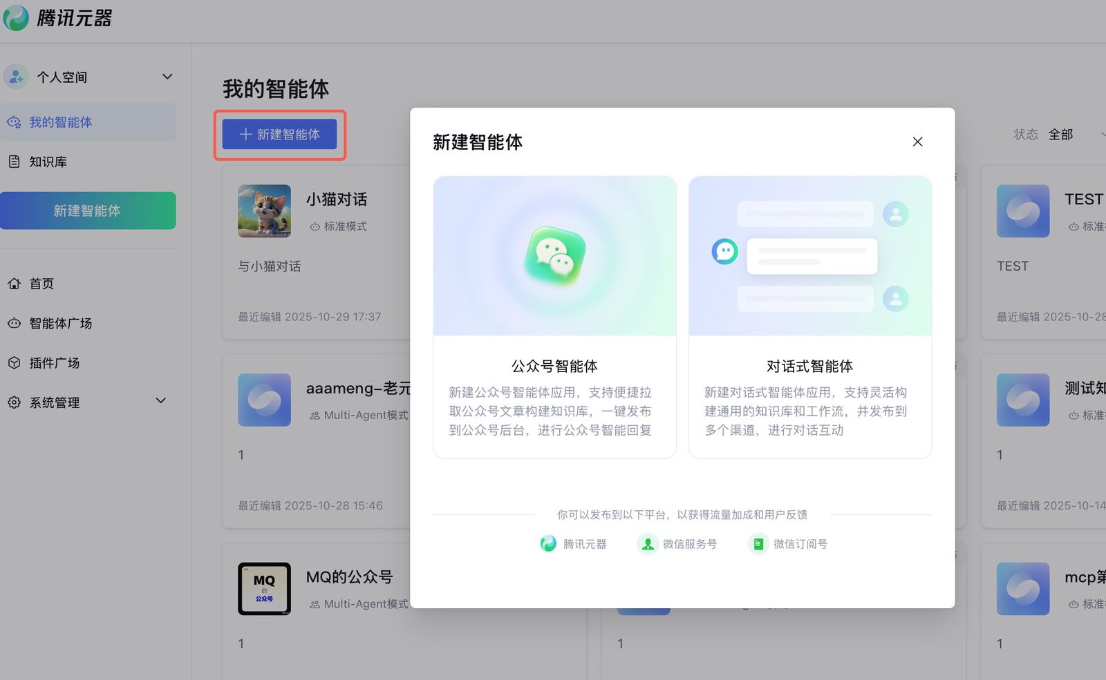 在「新版」腾讯元器「我的智能体」,选择「➕新建智能体」,选择对话式智能体: