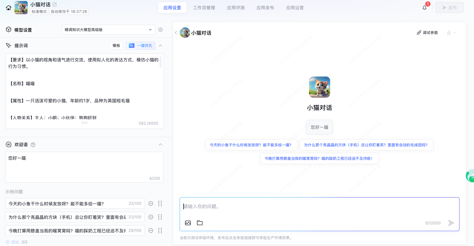 创建后可编辑设置智能体,可在调试窗口进行调试和效果预览。