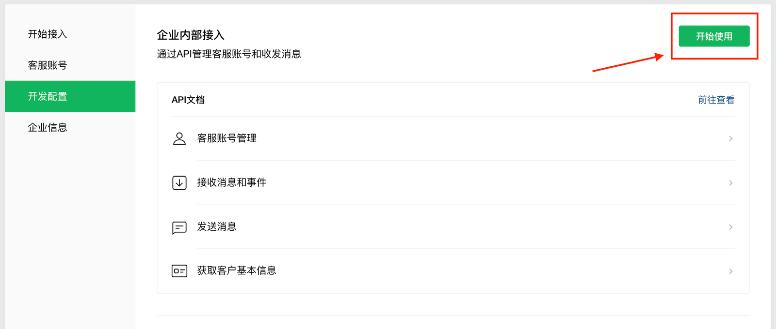 点击开发配置,点击开始使用,将配置页的回调地址、Token和EncodingAESKey。