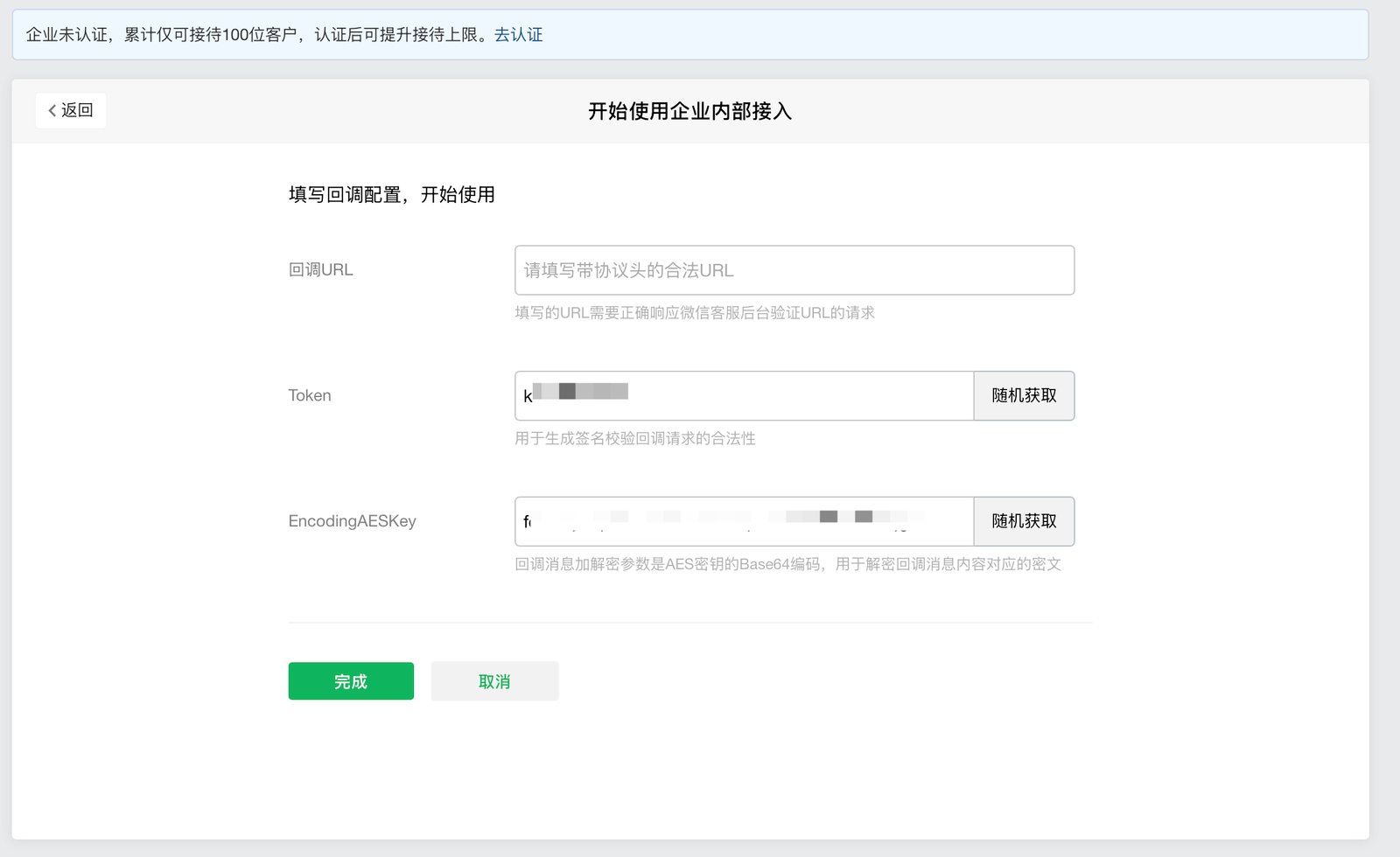 填写前请确保企业已完成微信客服平台的注册和认证,否则将无法配置回调URL。