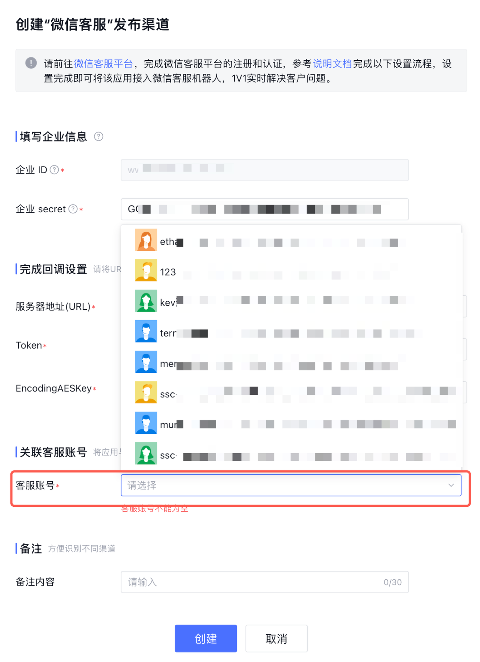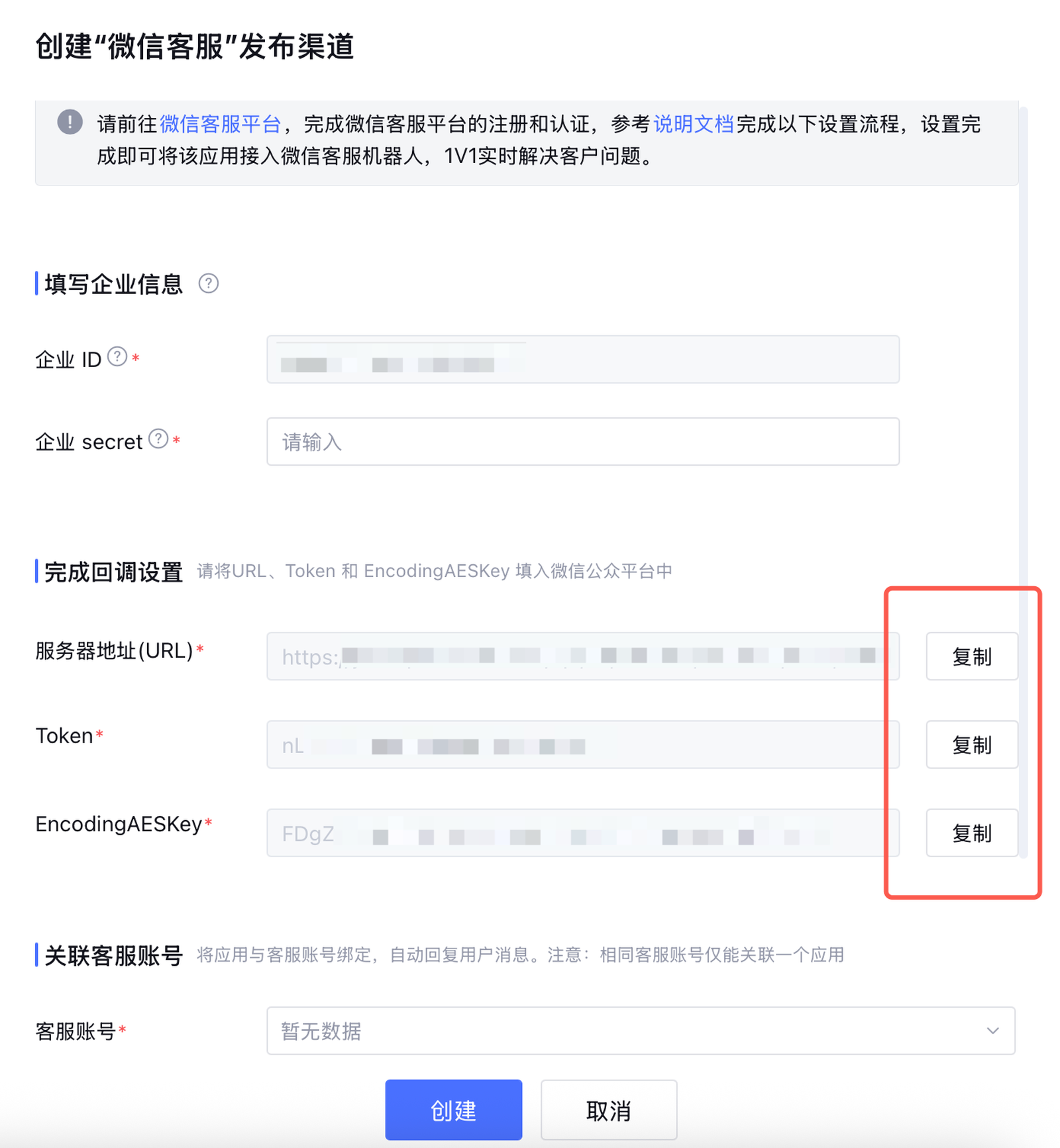 在配置页填写企业secret后,可在客服账号选择对应账号,点击创建可完成整个配置。