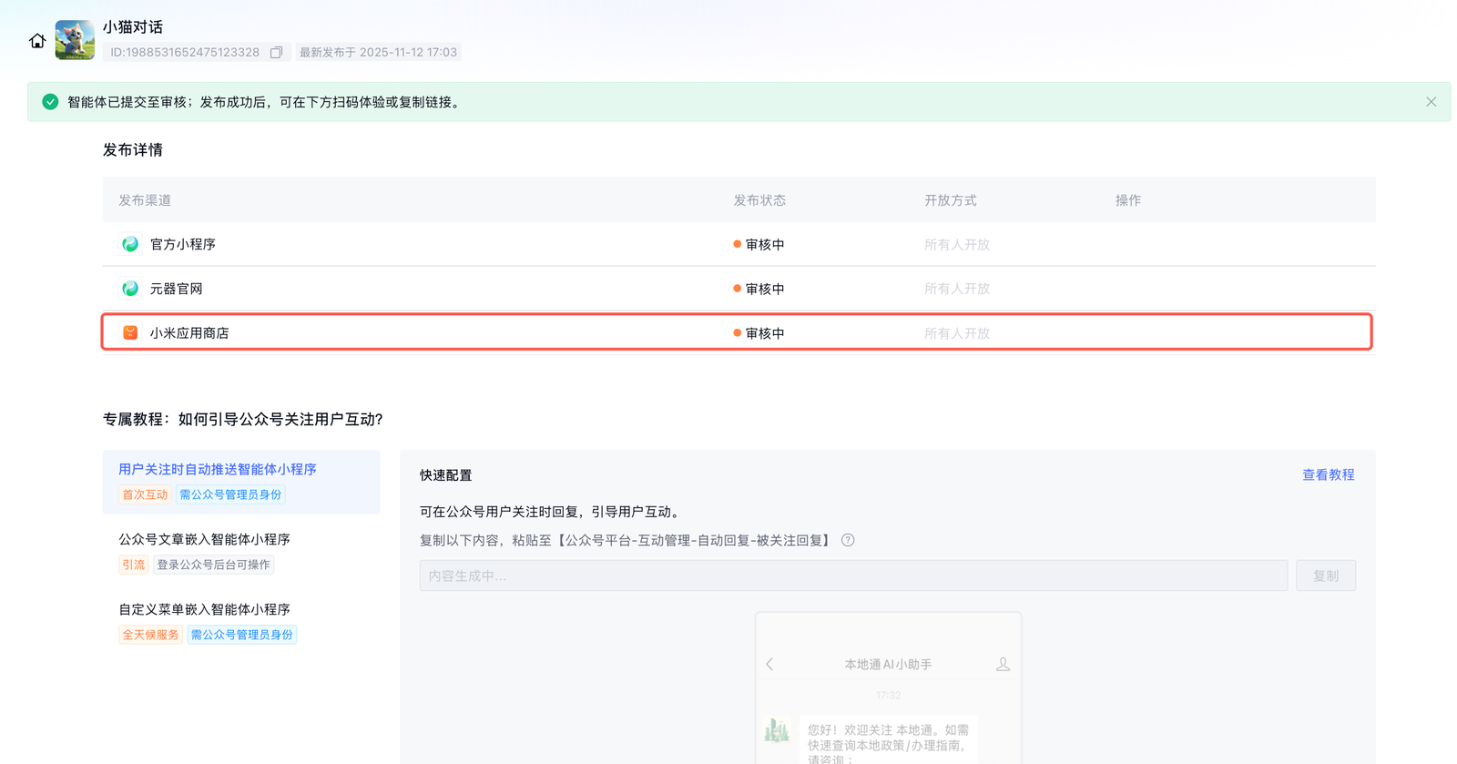 2. 审核通过后,智能体将在小米应用商店上架;