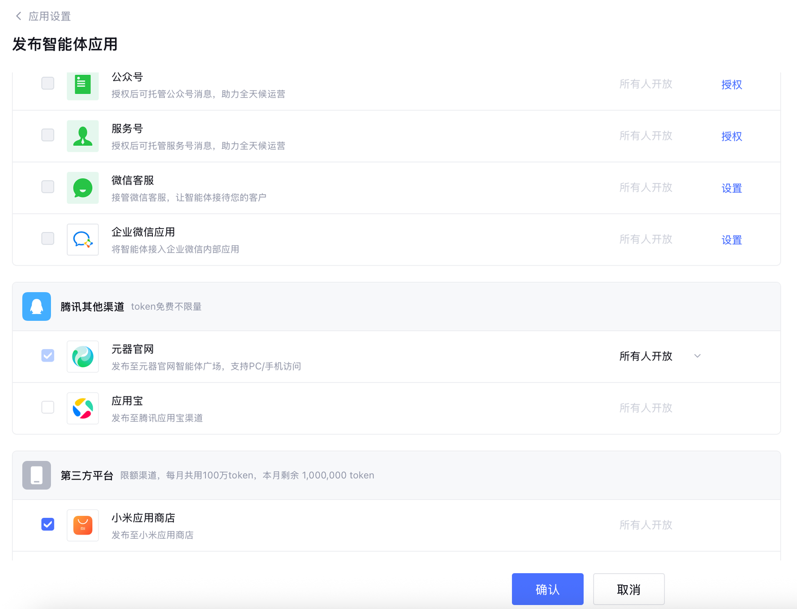 在发布设置页面中勾选「小米应用商店」后,确认发布。