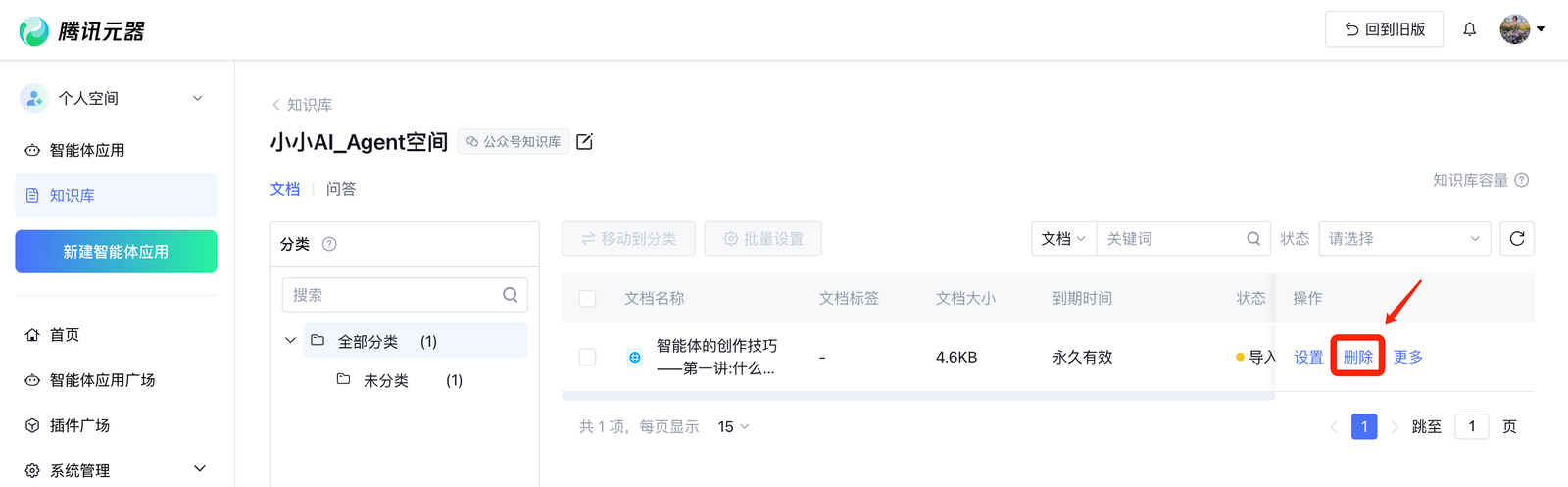 点击公众号知识库文档列表记录右侧的操作面板中删除按钮,删除已经导入的公众号文章。