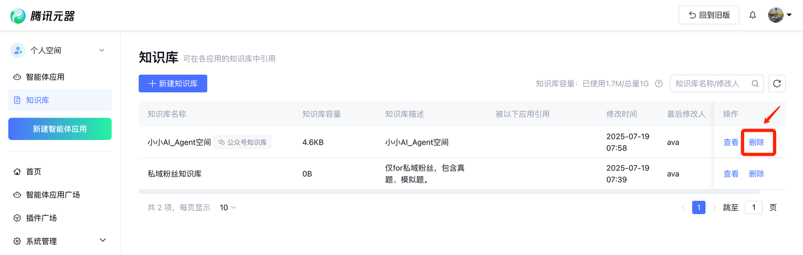 方式1:点击知识库列表记录右侧的操作面板中删除按钮,点击后会删除公众号知识库并清空整个公众号知识库中的内容。