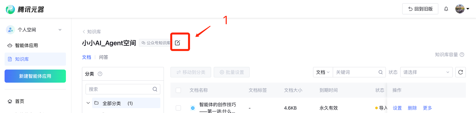 导入知识后,在智能体应用的知识管理tab,点击默认知识库的下拉框,通过+添加知识库添加这个公众号知识库。