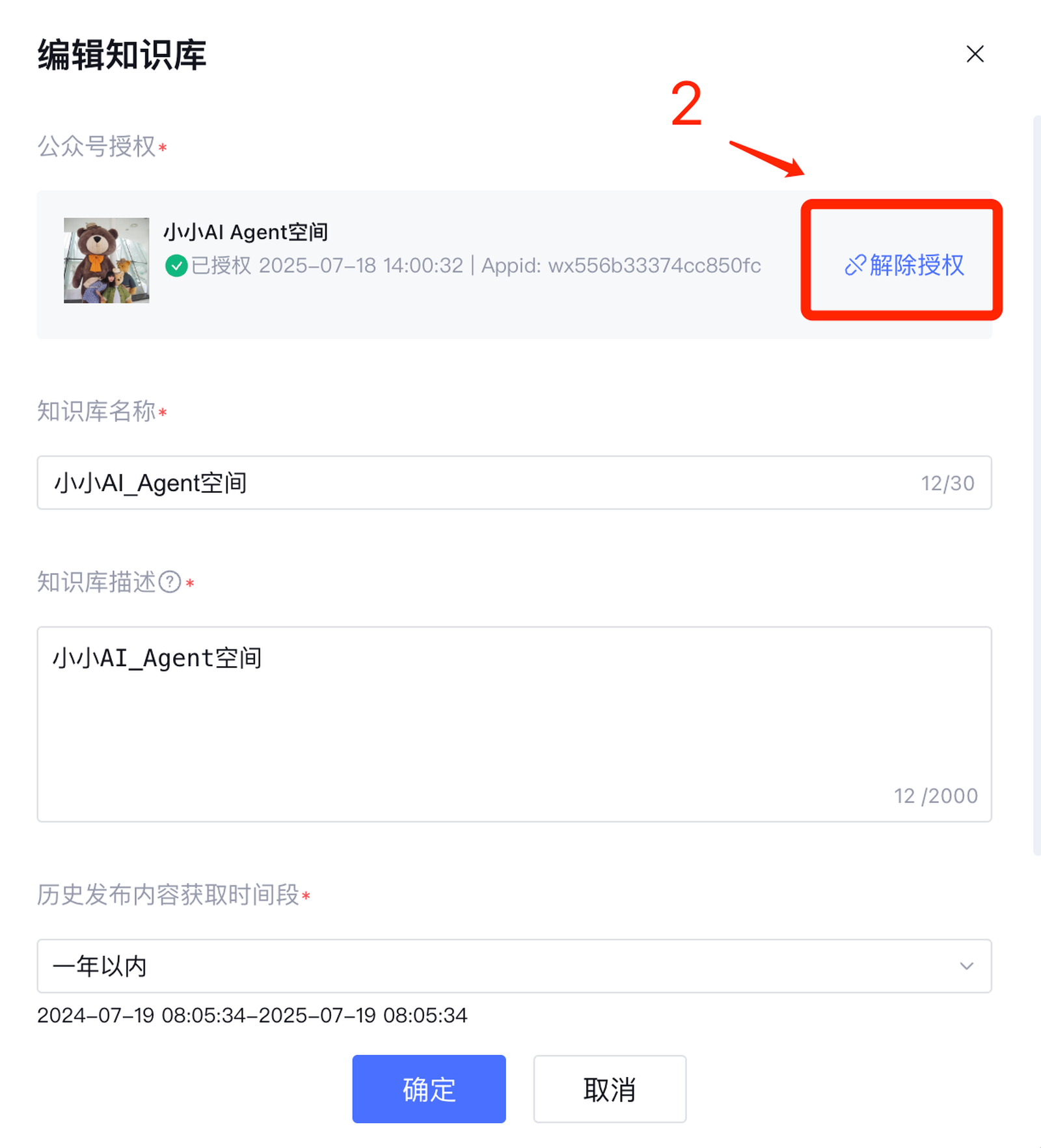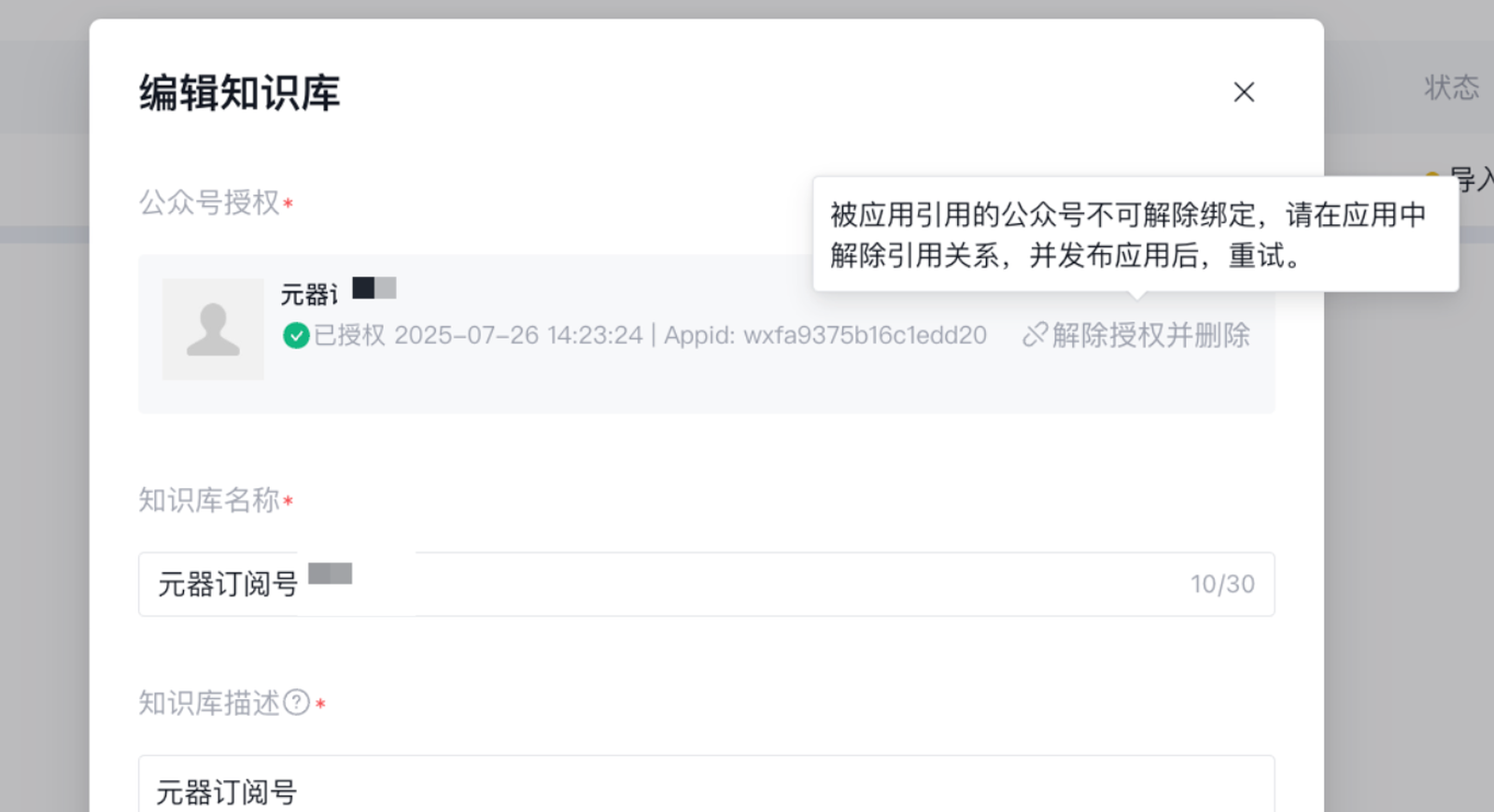 方式2: 在查看公众号知识库时,点击公众号名字边的编辑icon,点击解除授权。解除后删除公众号知识库并清空整个公众号知识库中的内容。