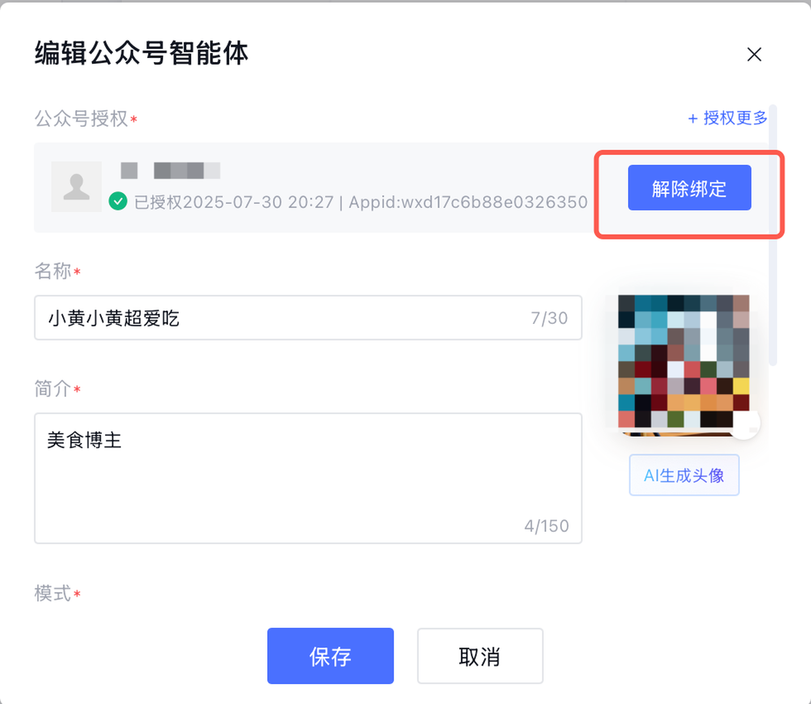 此时需要对公众号智能体解除绑定后才能做上列操作:
