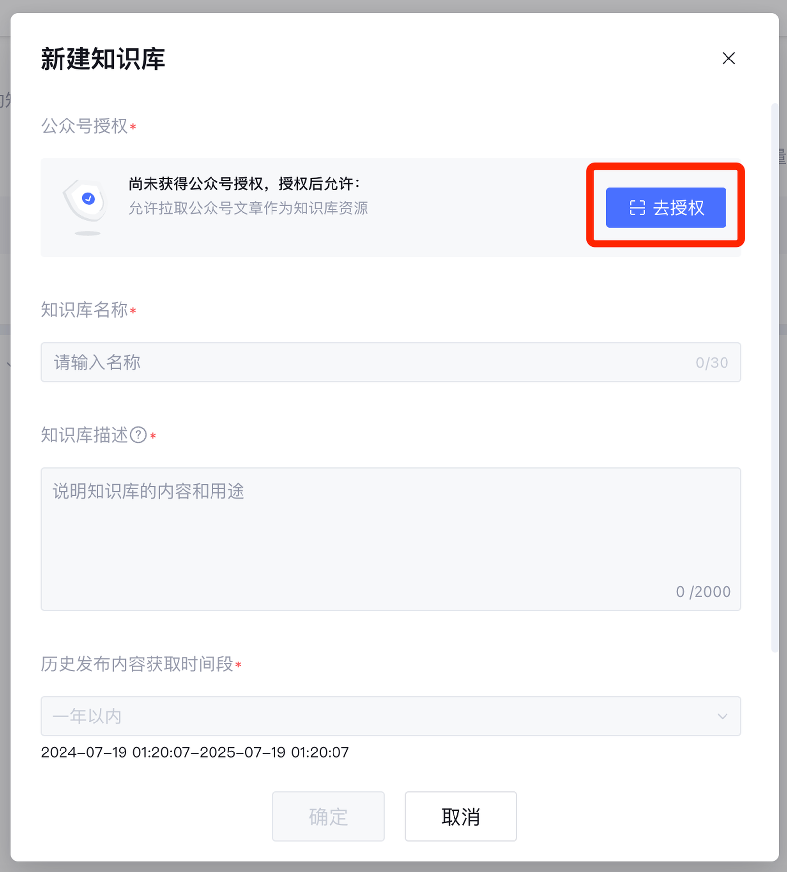 3、授权后按需填写知识库名称与描述,设置历史发布内容获取时间段,点击确定,完成公众号知识库的创建。