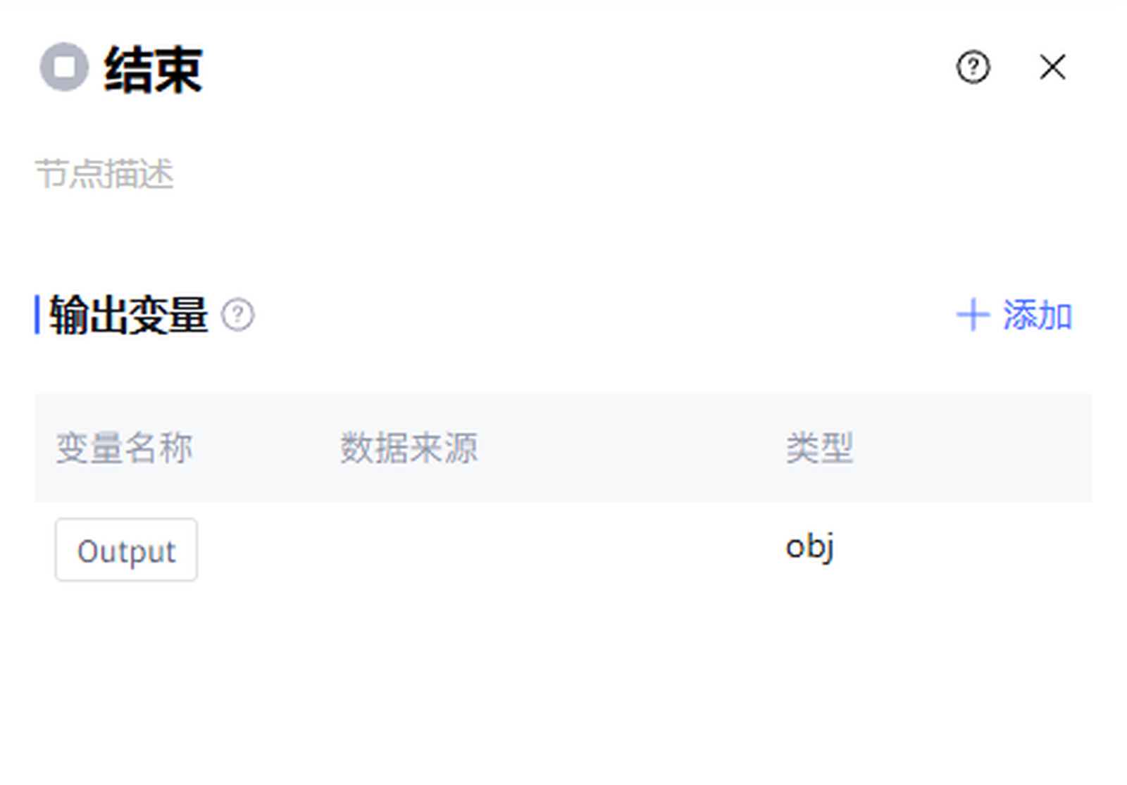 用于返回工作流运行后的结果。支持用户进行如下配置手动新增输出变量。