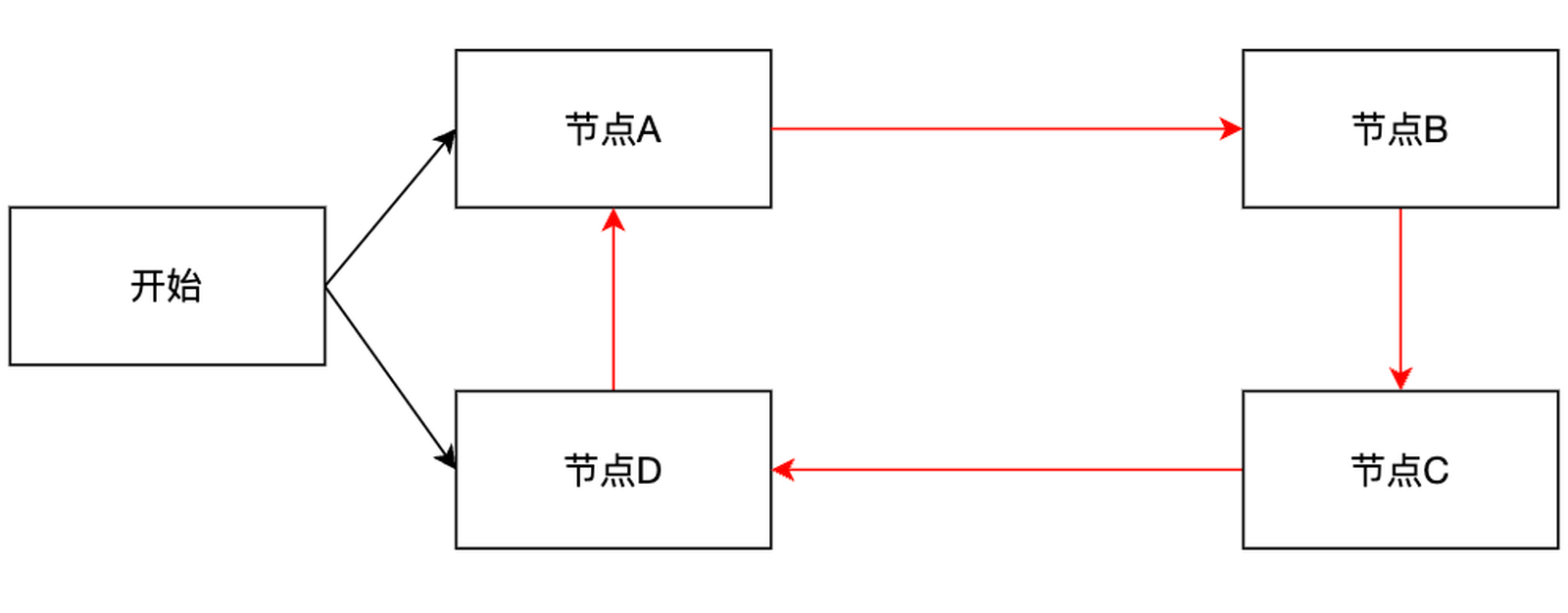 ❌错误示例:节点A -> 节点B -> 节点C -> 节点D ->节点A的环状连接。