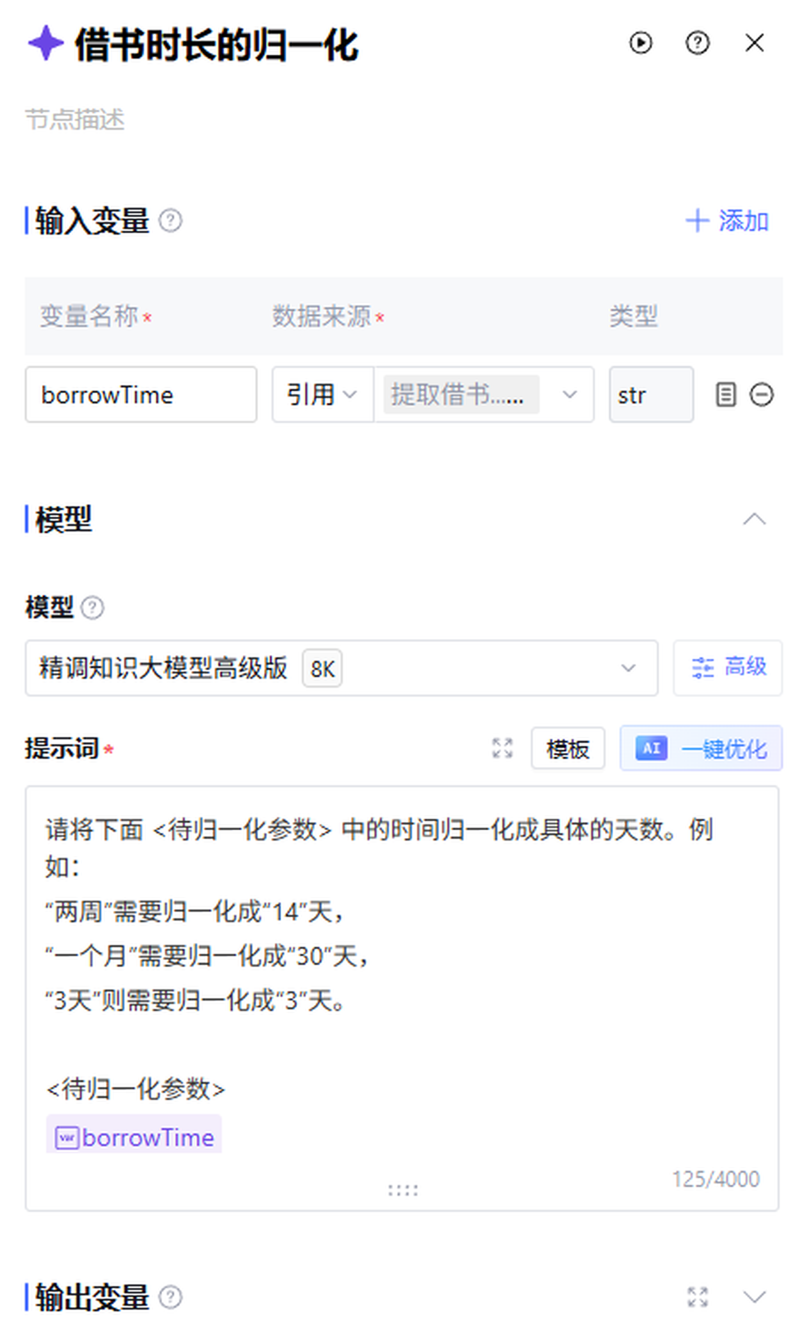 数据来源 | 该变量的数据来源,支持"引用""输入"两种选项。"引用"可选择前序所有节点的输出变量,"输入"可手动填入固定值 |
