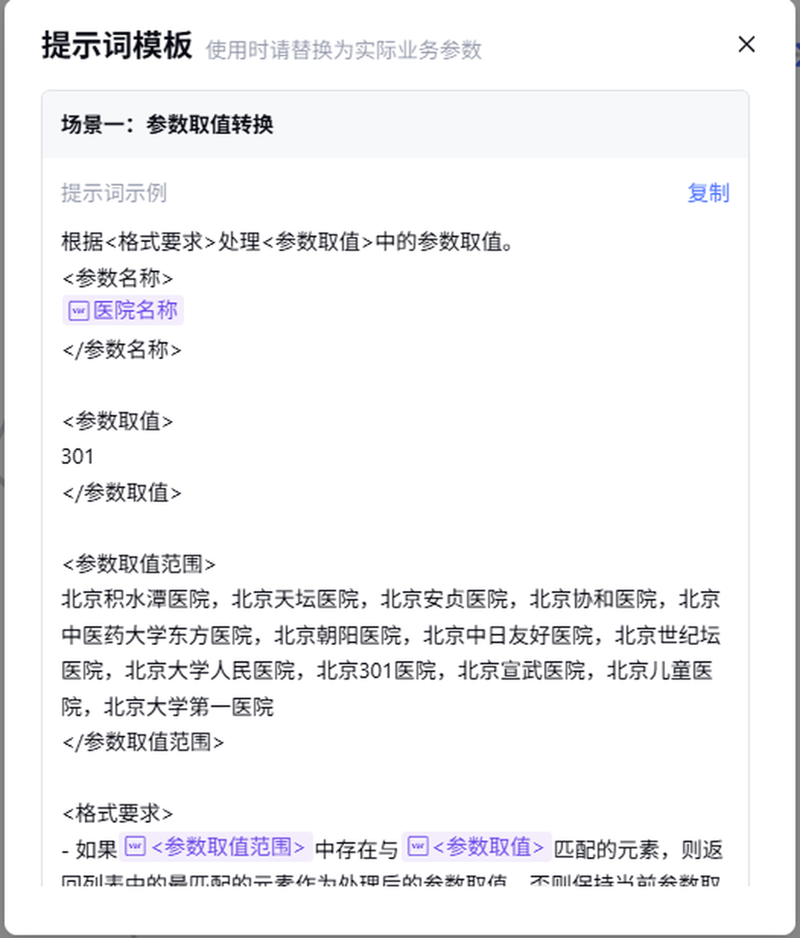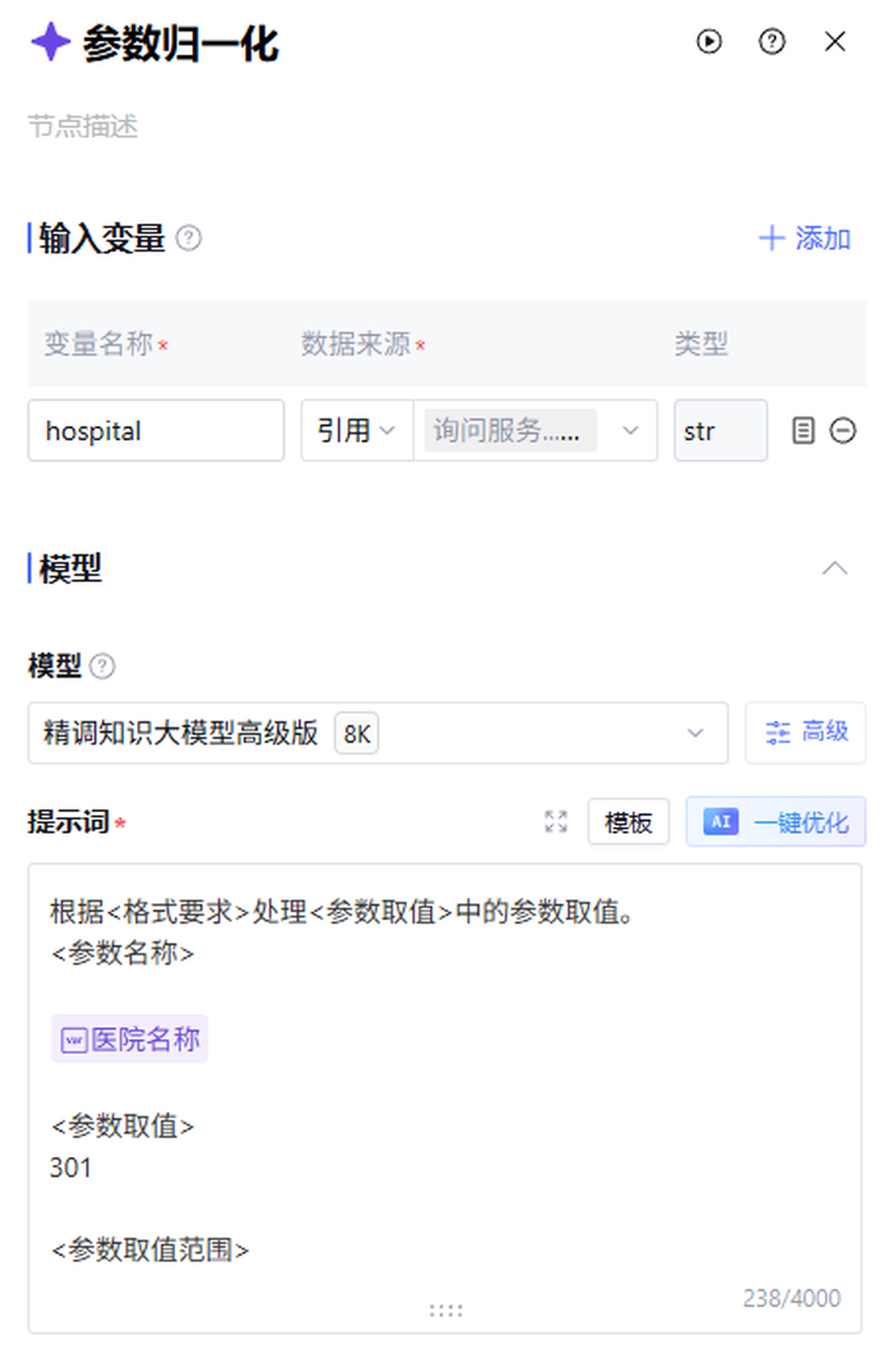 假设前序节点提取到的医院名称放在了"待归一化医院名称"变量中,此时 Prompt 示例如下: