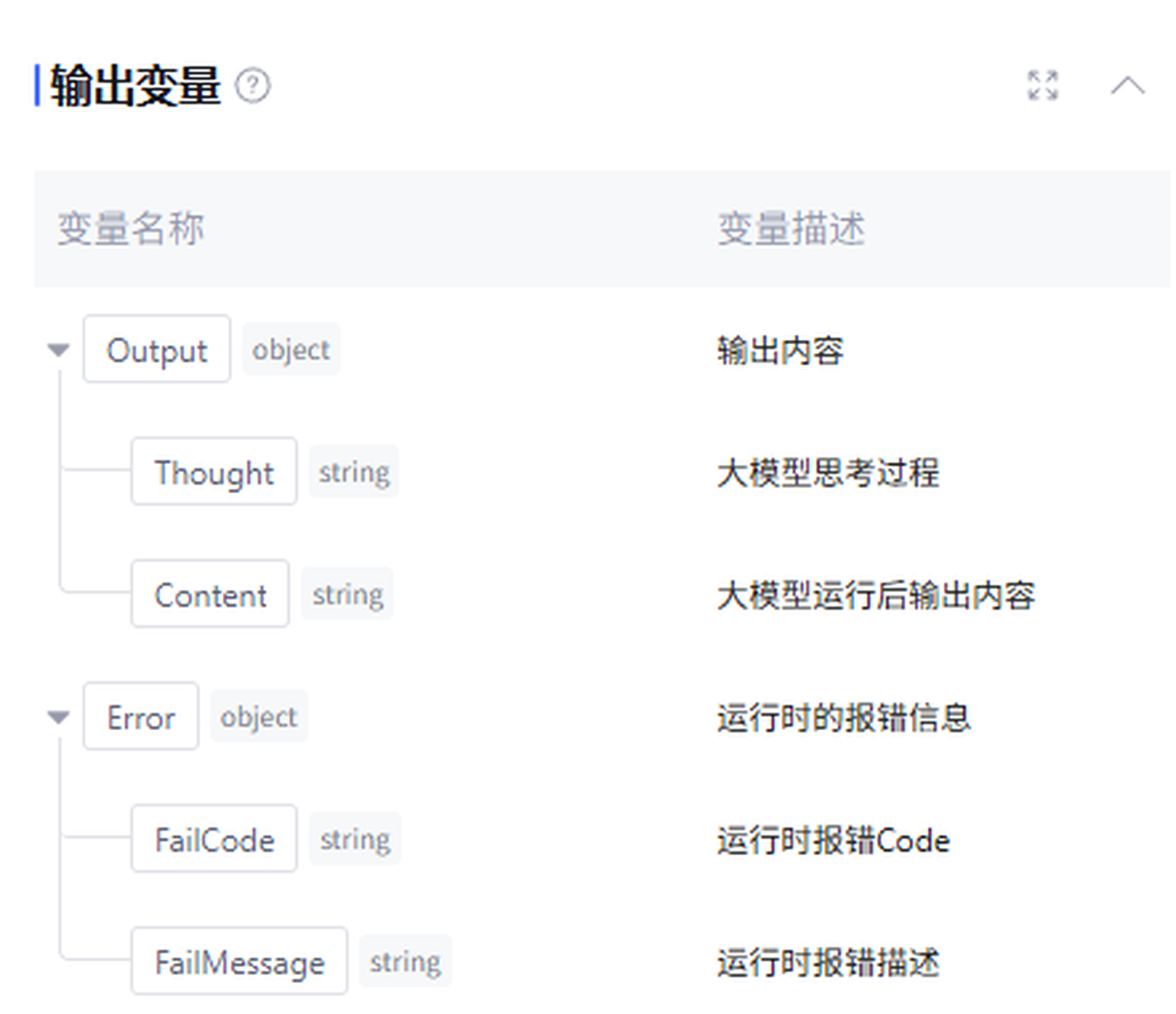 经该节点处理后的输出变量,默认为大模型思考过程与大模型运行后输出内容,以及运行时报错信息Error(数据类型为object,正常运行时该字段为空)。不支持手动新增。