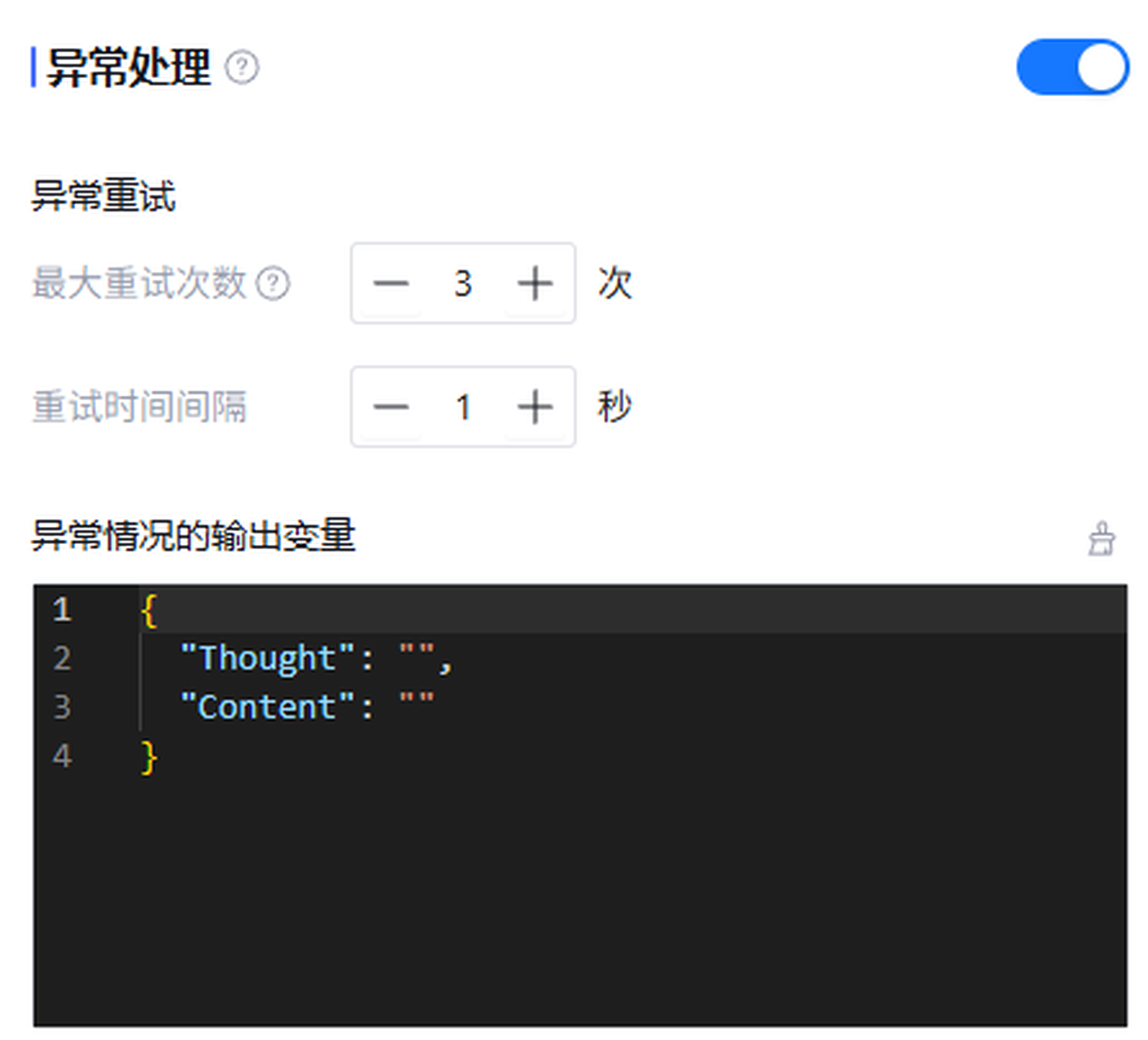 可手动开启异常处理,支持异常重试和异常情况的输出内容配置。配置内容如下。