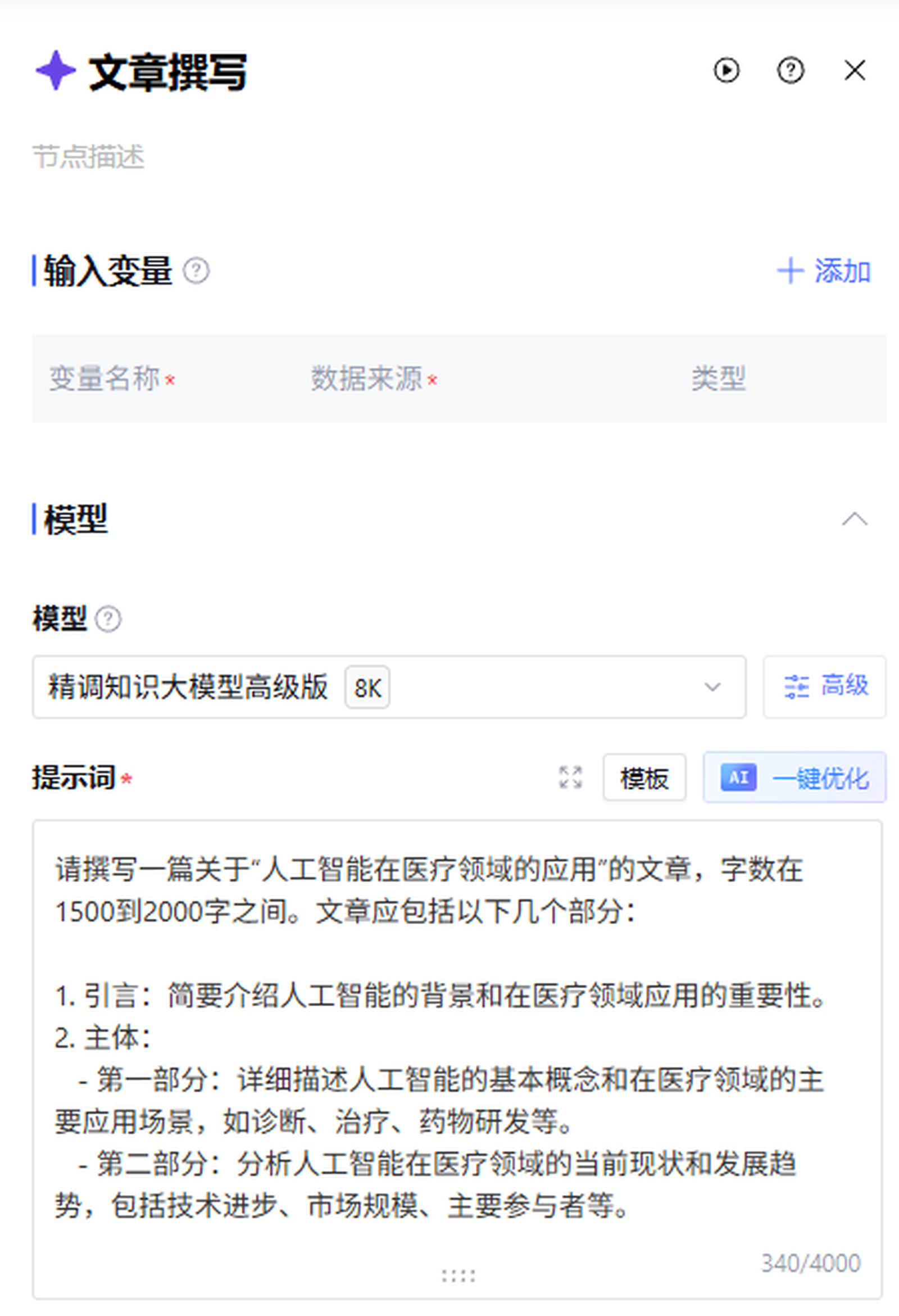 在文章写作场景中,您可以通过 Prompt 定义写作要求,利用大模型直接生成文章。