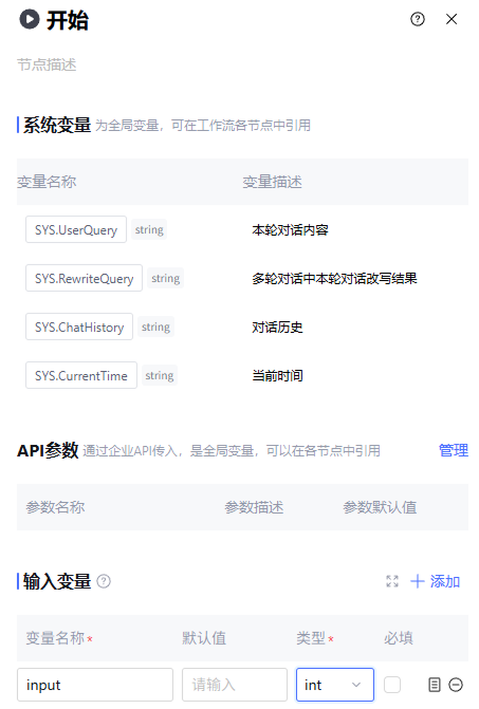 表示腾讯元器系统在运行该工作流时所需要输入的变量,支持用户自定义。该变量主要用于工作流间的流转(例如主工作流中的变量传递到子工作流,此时子工作流的开始节点需要通过输入变量接收)。